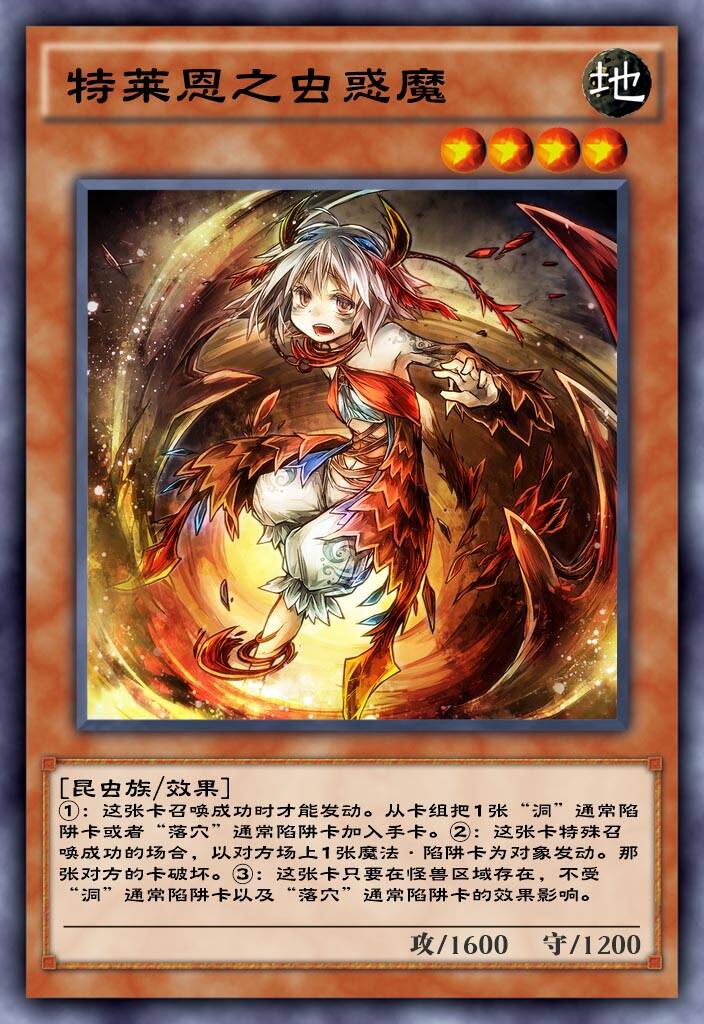 本次国服的独占卡,也是虫惑魔本家核心下级,此卡召唤成功时可以从卡组将“空洞”或“落穴”通常陷阱卡加入手牌.此卡特殊召唤成功的场合,破坏对手场上一张魔法·陷阱卡!并且场上的此卡还不受“空洞 ”和“落穴”通常陷阱卡的效果影响.通招即可检索奈落或者无底对对面造成干扰,配合活死人的呼声或者强化苏生复活也能二速破坏对面的后场,想玩虫妹的话这张卡需要满3.