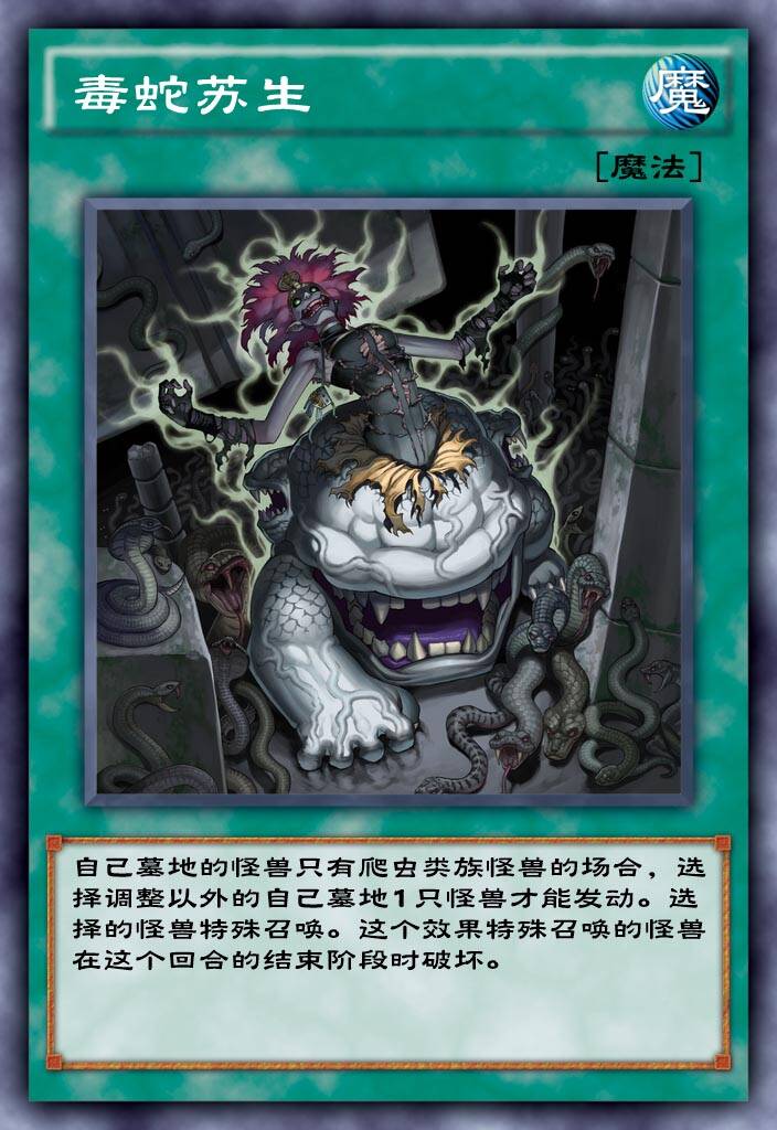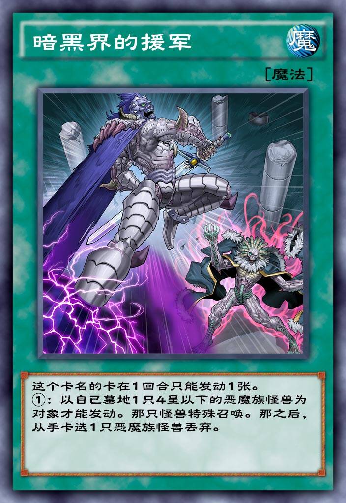 黄金包复刻卡,以自己墓地1只4星以下的恶魔族怪兽为对象才能发动。那只怪兽特殊召唤。那之后,从手卡选1只恶魔族怪兽丢弃。由于第一回合不能确保自己墓地有怪,所以暗黑界本身也不会投入这张卡,推荐抽0-1即可.