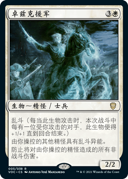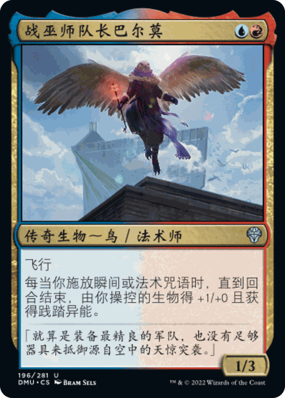 如果我们攻击三个对手,卓兹克援军会让我们的所有精怪变成4/4,它甚至可以保护他们免受伤害法术的影响,比如渎神行径。我们甚至从多明纳里亚:众志成城中获得了一个新的终结者:战巫师队长巴尔莫,使我们施放的每个咒语都是一个威胁,所以如果我们能施放足够多的咒语,我们就可以有一堆巨大的,飞行的,践踏的精怪,以确保我们踢出致命一击。