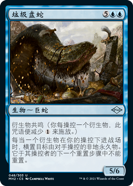 如果我们在场上拥有垃圾盘蛇,我们便可利用我们的衍生物来横置对手的非地永久物。它可以横置最可怕的生物或为致命一击扫除任何的障碍。另一张很棒的卡是神秘映影,它可以提供额外的价值,使你的衍生物成为场上最好生物的副本。但是,请记住,除非您同时创建多个精怪,否则它只会影响一个正在创建的衍生物。