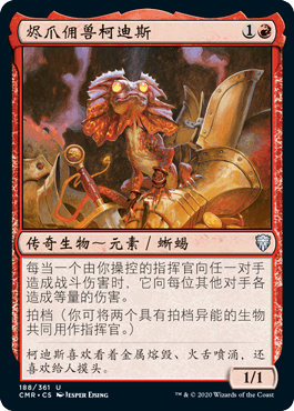 我是入城钥匙的忠实粉丝。它让艾尔莎踢对手的时候不用担心会有什么厉害的阻挡生物。但是,对每个人造成指挥官伤害是一项繁琐的任务,特别是当我们需要多次触发灵技来让艾尔莎变得超级大的时候,,所以我们需要像烬爪佣兽柯迪斯这样的卡。虽然柯迪斯造成的伤害不会计入指挥官伤害,但它仍然是一个强大的效果,将帮助我们结束比赛。同样,如果茜卓扬焰如果不能当场赢得比赛,那肯定也会对我们有利。