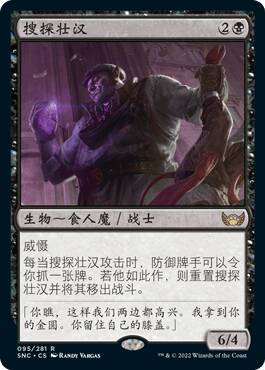 黑色在本次DMU系列中获得了巨大的补强.之前DK一直吹捧的SNC364搜探壮汉依然出现在赛场上.即使对手可能会有黑魔判在场(启示天灾希欧蕊).另其的进攻显得特别愚蠢.但搜探壮汉在前中期的威慑力还是很大.在以中速套牌占据大头的环境内.牌差显得尤为关键.虽然4点防御力在消灭邪物的射程范围内.但3费6/4且威慑的身材.对方即使中一脚也会觉得窒息.抓一张牌重置也不亏.