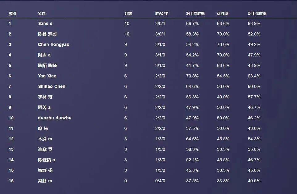 以上是16位参赛牌手的比赛积分.