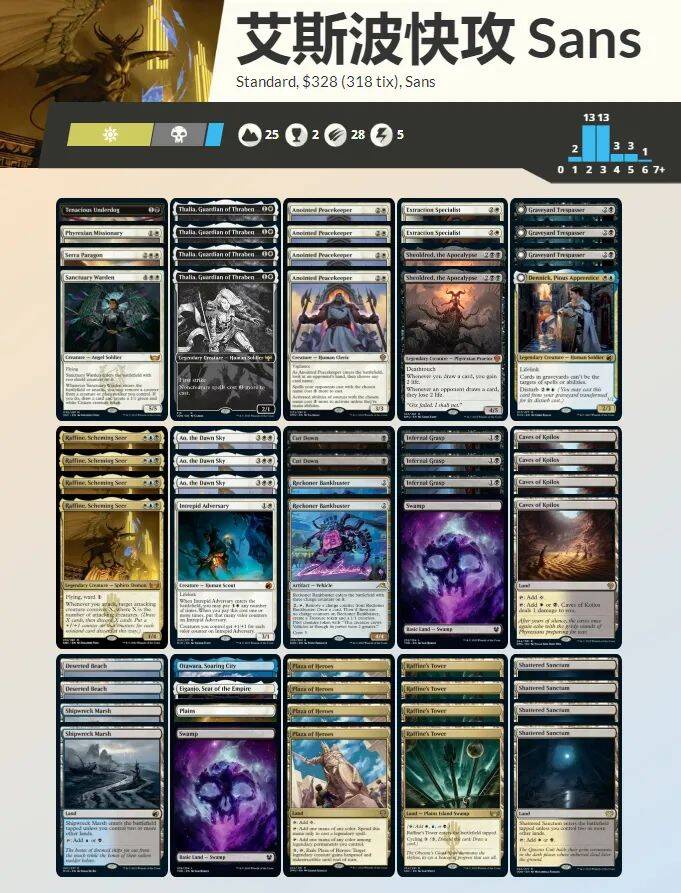 近两次的比赛.无论是本次冠军套牌艾斯波色组或是沾白色套牌中已经能见到莎利雅的频繁登场.在对战快攻亦或是生物套牌2/1先攻的身材.或是对战控制套牌时非生物咒语增加1费施放的异能.都能呈现出不错的效果.如若能在2回合出莎利雅且3回合能顺利结算拉斐茵进场.那将会是对手的噩梦.