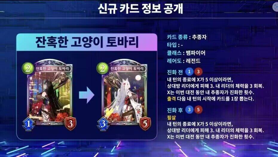 自己的回合结束时,如果“本局对战中,自己的随从进化的次数”为5以上,则会给予对方的主战者3点伤害,回复自己的主战者3点生命值。