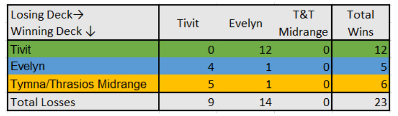 通常我会分别讨论各个主将的对局优劣和克制关系,但这次会有些不同。在之前的调查中,个别焦点主将之间缺乏对局数据,这种情况此次仍有出现。棣维特和艾弗琳多次在同一局里出现,但他们和T&T中速之间几乎没有对局。总而言之,焦点主将占有这次调查中总出场次数的8.94%(379次亮相),但他们之间的对局只占6.07%(23次),其中大部分还是棣维特对阵艾弗琳。这些数据意味着我们的“焦点主将”来自至少两个被大量采样的环境,这也增加了他们在本次调查中的热度。如果扩大采样范围,我们会得到更准确的套牌多样性。