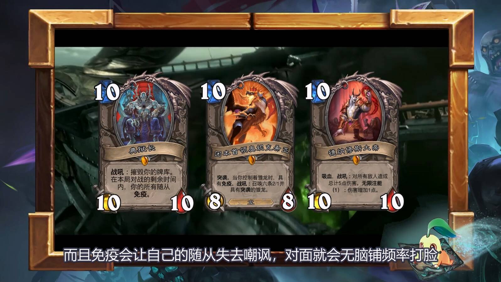 相对来说,典狱长可能没大家想的那么强,虽然群体免疫这个idea很酷,但也要考虑竞技场的基本情况:这个优势出去确实无敌,可以一路平推,但毕竟是10费卡,当回合下去又没有团本、大帝的解场能力,而且免疫会让自己的随从失去嘲讽,对面就会无脑铺频率打脸。总的来说,就是优势均势无脑强,劣势血量压力大时很难翻盘。