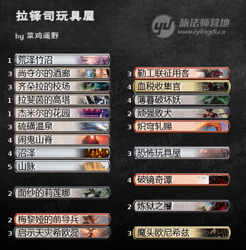 本期的主题单卡是恐怖玩具屋。出自依尼翠:猩红婚誓的这张神器牌其实有点类似当年伊克黎的幼子复仇,因为会影响身材,所以比较适合异能比较强的生物(说的就是你——我梦里的谗言密探)。正巧前段时间逛直播间的时候,看到有一个主播在玩恐怖玩具屋套牌,结果他突然捞出来一个梅黎娅的前导兵给对手一发爆头,我当时惊为天人:“居然可以拿来偷鸡?! ”经过一个多星期调试之后,终于整出来下面这套牌,并且在直播中打出来5-2这一不错的战绩。