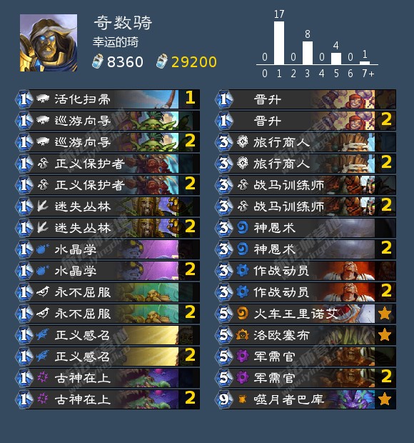 记录向,如果理解不到位还请轻喷。回归玩家,狂野打到青铜5就没有额外星了,月末几天,144/213,68%胜率到传说(不少局是不熟悉对面卡组微操有问题)。一共用了3套卡组上分,分别是奇数骑、号角花园骑和剑鱼贼,奇数骑从青铜打到白金,前期创下了24连胜的记录,前期脚本居多,效率很高,但是白金之后随着真人变多,奇数骑上分就比较艰难了,虽然铺场很快,但返场能力并不强,韧性不足。之后用了营地大神“凛冬将至丨一方”的号角花园骑和朋友推荐的一个主播的剑鱼贼,轮番上阵,成功传说。这两套牌都很强,可以根据环境换着用。