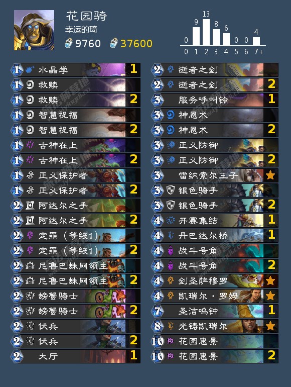 mini包出来之后,奥秘法很多,反制怪物的奥秘法还是蛮针对骑士的,因为这套骑士手中的随从并不多,往往留着一个杀手锏剑圣却被卡着很难下,而且有时候为了解场,打不到脸,会给对面触发抽牌奥秘,还有就是低费法术在前中期不多,容易被法反卡节奏。但是剑鱼贼试法反和怪**秘、打脸都比较容易,会让奥秘法无法施展。