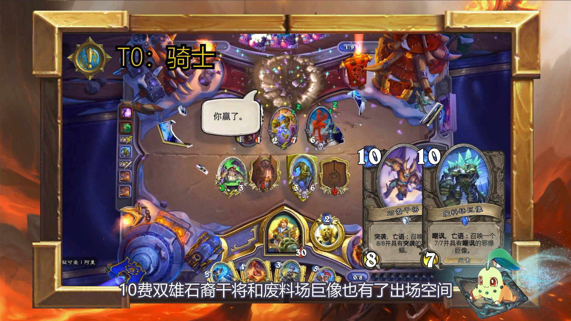 另一个原因则是环境里的AOE进一步减少,让骑士这种能铺的职业再受“隐性加强”。从之前的碉堡中士,到上个环境的龙喉喷火者,中立白卡总会有点群体补刀手段,但现在就是人均笨比,90%以上的套牌都难以处理餐会巨仆。