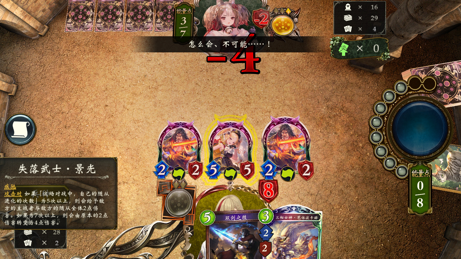 失落武士·景光能利用主战者效果,配合大参谋制造的双剑之技,在后期打出高额斩杀。配合另一张景光、骁战的鲁米那斯骑士,甚至有机会打出OTK。