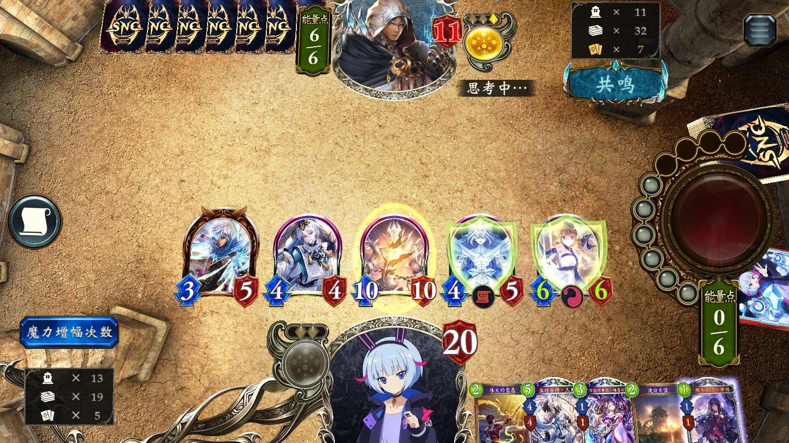 前期优先过牌、刷增幅。规划当回合、后续回合打法,选择合适的阴阳秘法目标,不要拘泥于给五行宗师·久苑刷增幅。通常不解场,但对手场攻高的话,可以在剩余2费的情况下使用睿智的神鸟,或通过魅惑魔法或伟大的意志少吃伤害。尽量不在触发全部效果前使用管弦魔法师。后手尽量不在刷够5增幅前使用万能的奇迹·梅露缇娜。前期尽量减少爆牌。