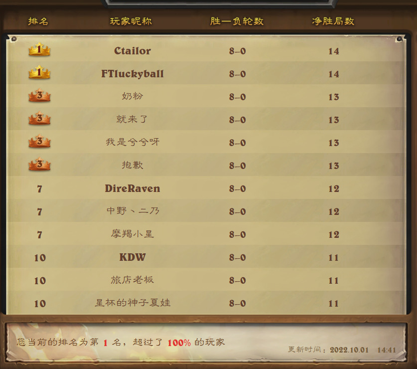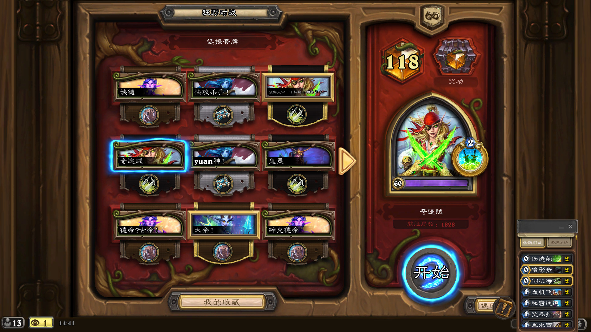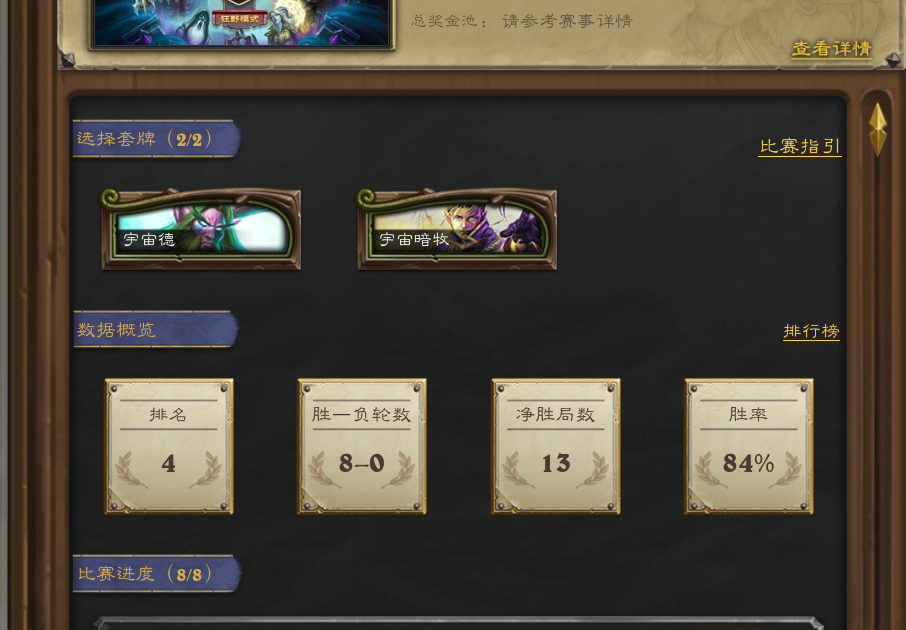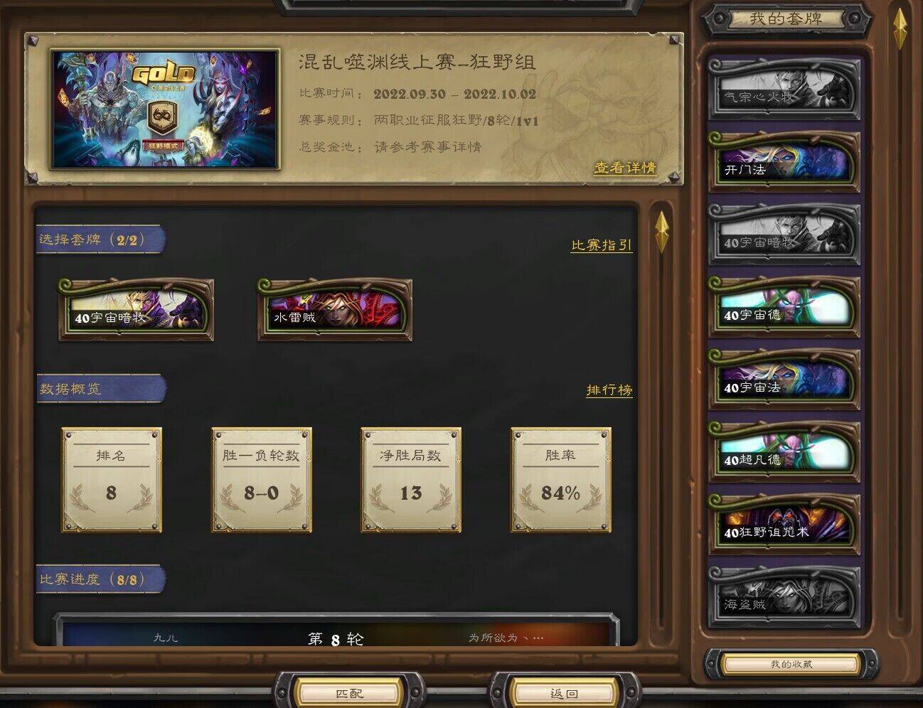 天梯卡组:偶数萨、宇宙术、宇宙猎×2、40剑鱼贼、机械骑、换家缺德、宇宙暗牧×2、宇宙骑、变装海雷贼×2、奇迹海雷贼、奇迹贼、奥秘法×4、激怒战、宝宝卷宗术、超凡典狱长缺德、大哥牧×2、青玉萨、任务牧、