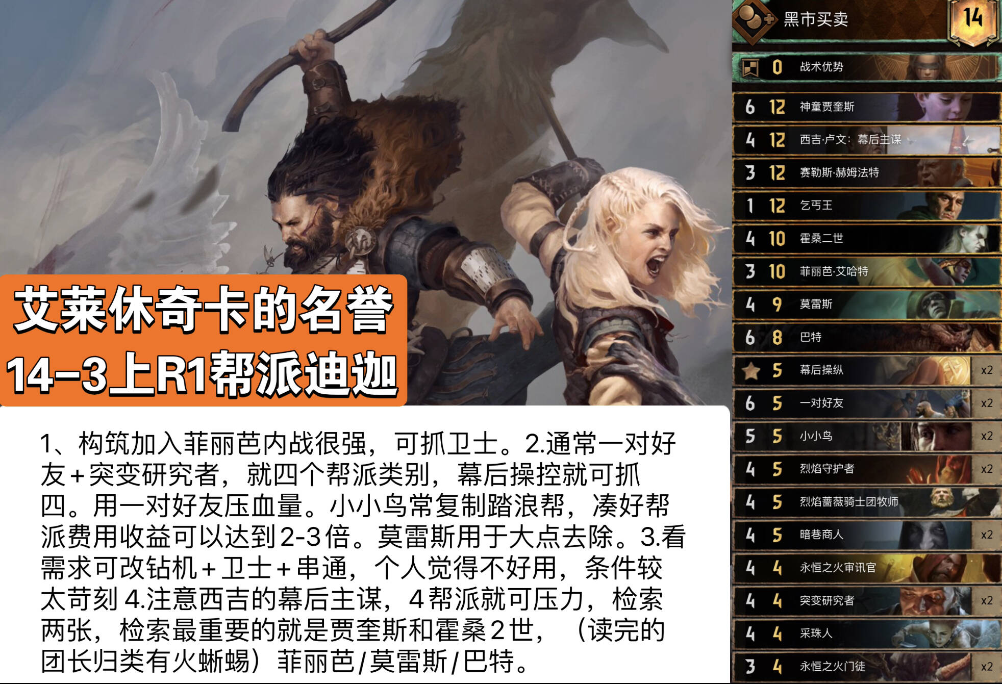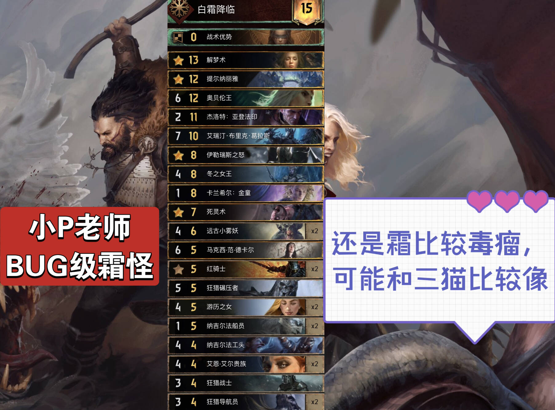 奥克温这卡太强了,后手R1很好平卡对面,先手如果不需要抢R1也可以留到R2逼牌,单论点数来说这卡巨大,本身是个超大的引擎,同时附赠5次共生,铜卡在不配合奥克温的前提下其实是有点疲软的,但是有了奥克温节奏就非常舒服了,这一波赤诚共生真的得到了大加强。青蛙卡下场10点也很不错,用来R2配合猫老大逼牌效果极佳,目前首日小伤害除了北方几乎没有,对战霜怪更是完全没有手段解小青蛙,后期可以配合棱镜也是一个很好的思路(可以把女术士换成棱镜,长局肯定不会亏的)