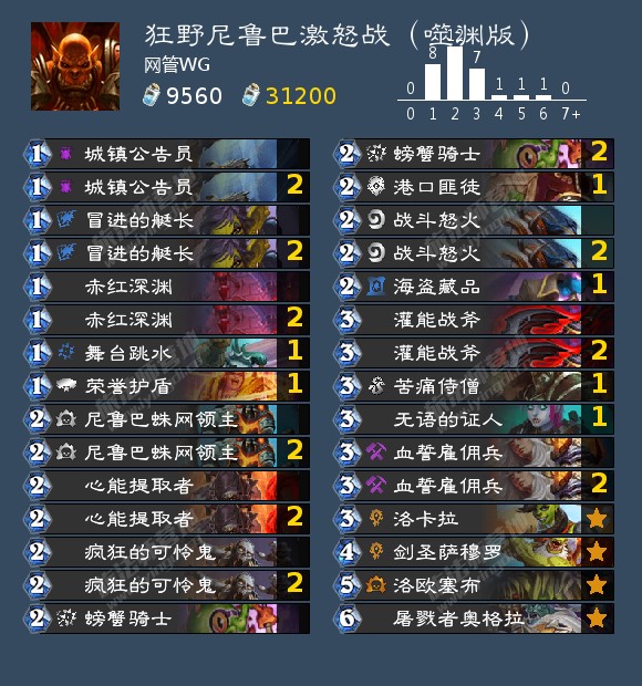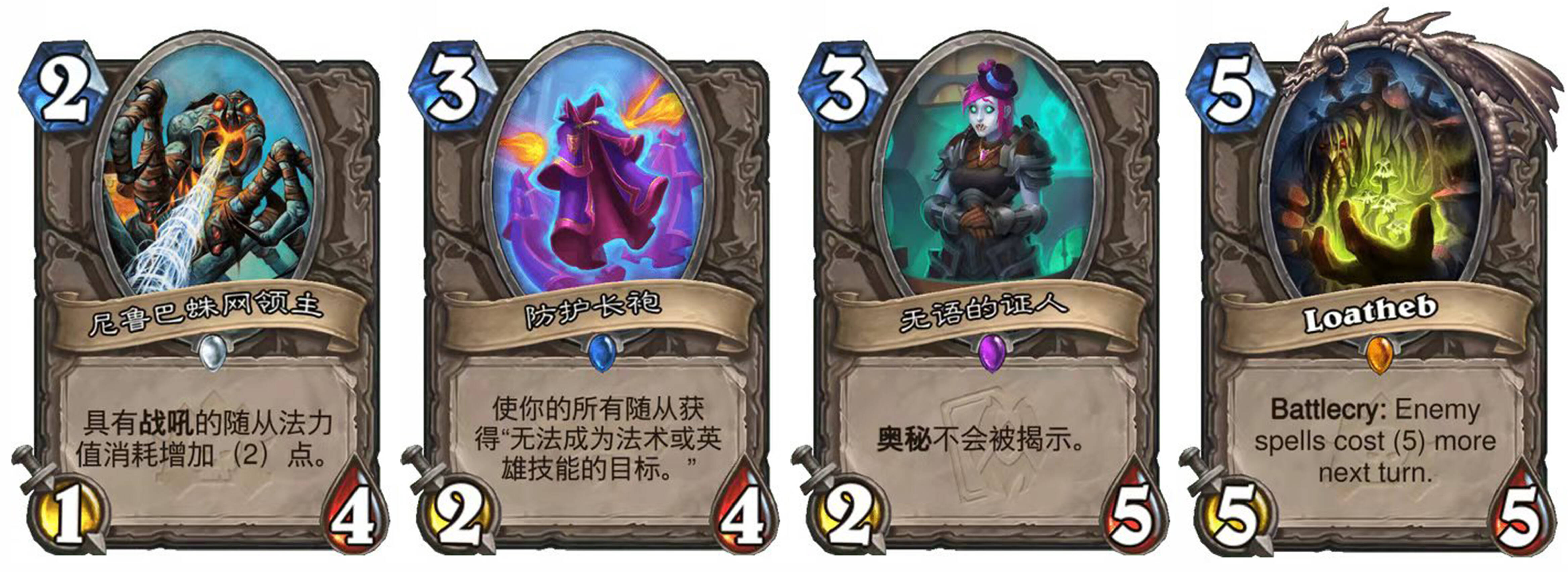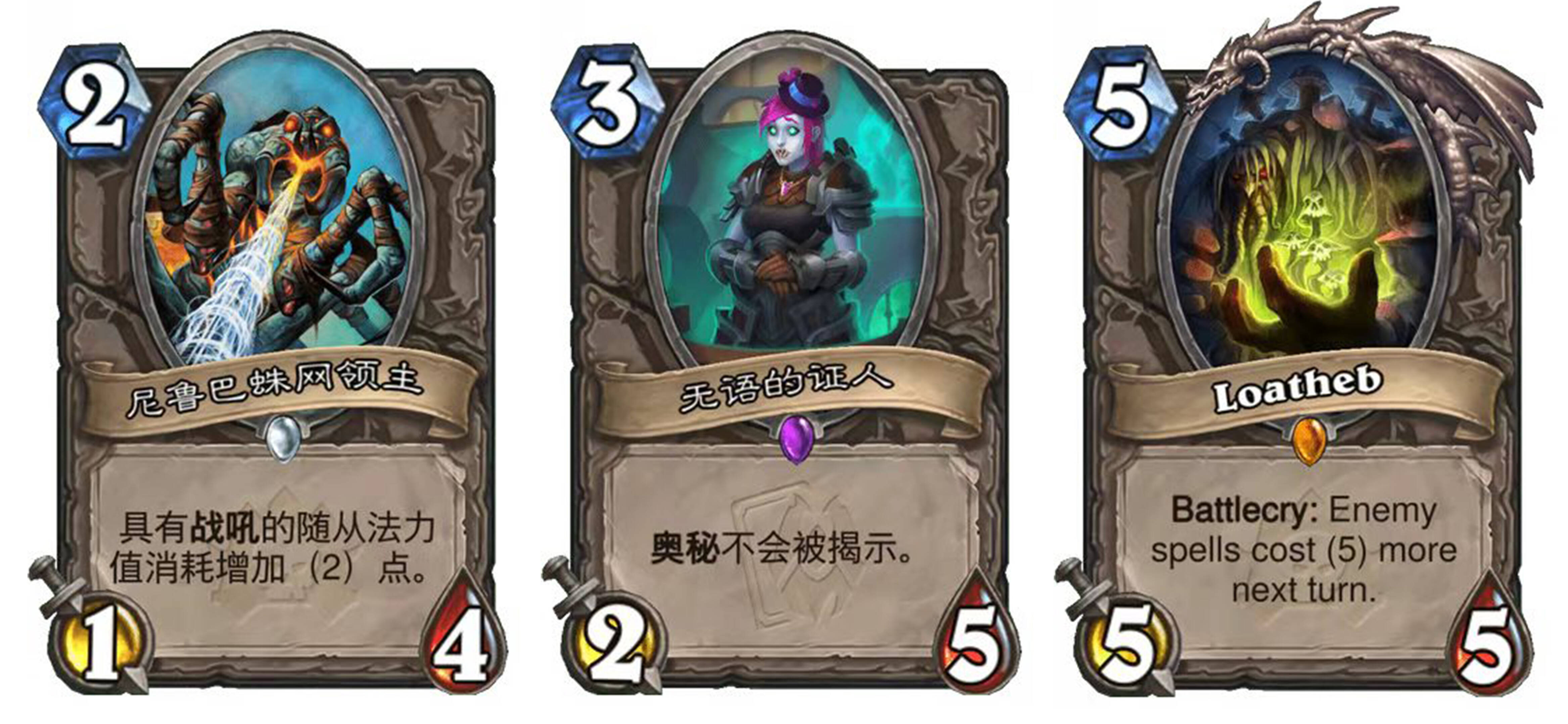 ·尼鲁巴蛛网领主:最早是作为对抗宇暗牧、战吼萨等卡组的利器,现在成为限制奥秘法的一张关键卡,对阵鬼灵贼、开门法也有不俗表现,4血的大屁股很容易被武器buff起来,从而实现不断滚雪球的收益。