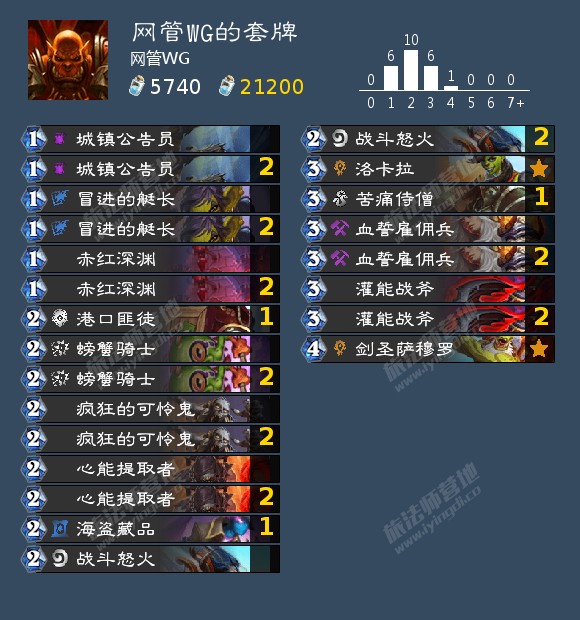 ·邪恶的厨师:之前一直携带的一张优质过牌,但是在迷你包上线后狂野环境明显提速,前期不再有多余的伤害打脸,故暂时舍弃,等后面时机合适时可替换掉一张城镇公告员。