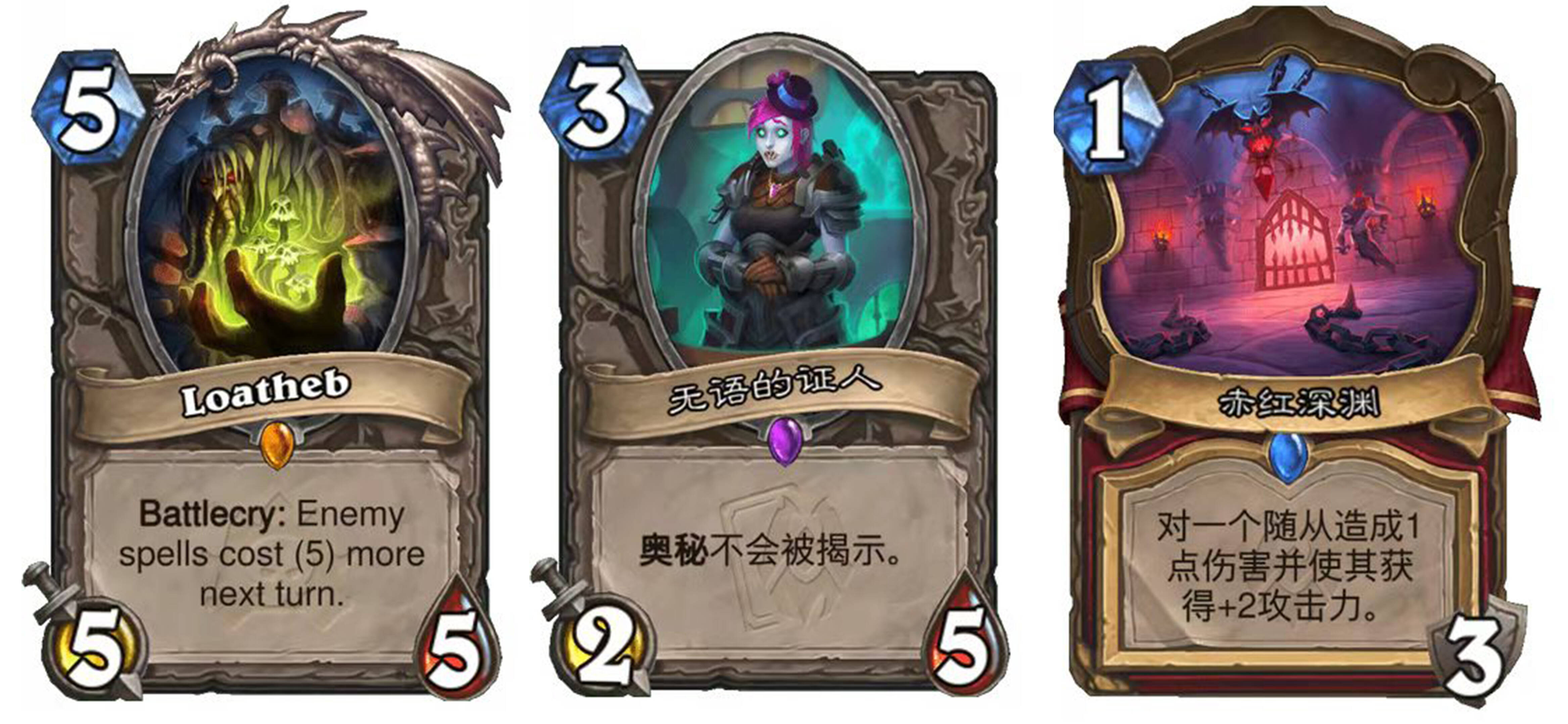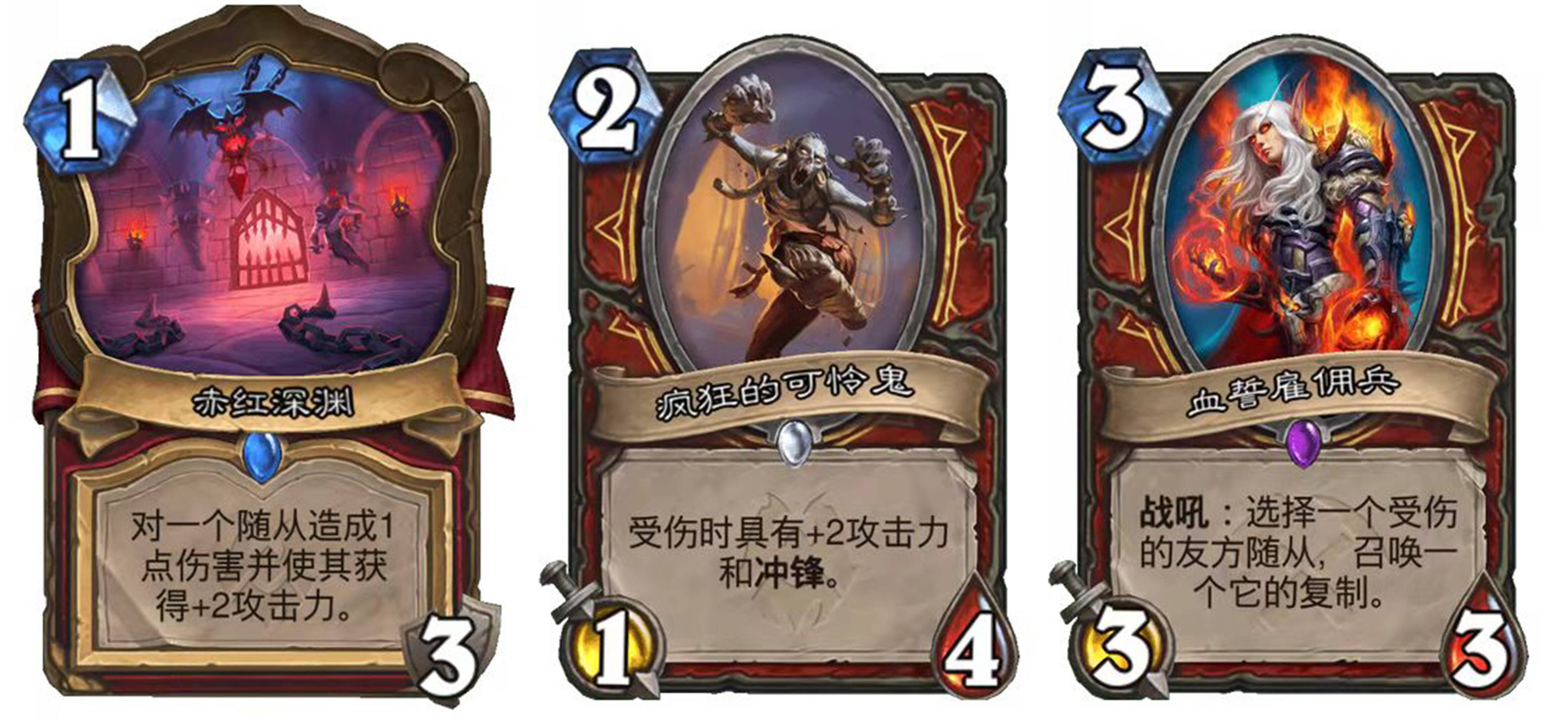 ·赤红深渊:为数不多的优质低费激怒组件,可以近似看成3张散装的怒火中烧或监工,上次补丁暗改后统一变为先+2攻再造成伤害,配合螃蟹骑士、可怜鬼、剑圣等效果最佳。如果场上同时有两张地标牌,建议优先使用完其中一张耐久,以便尽早腾出格子。
