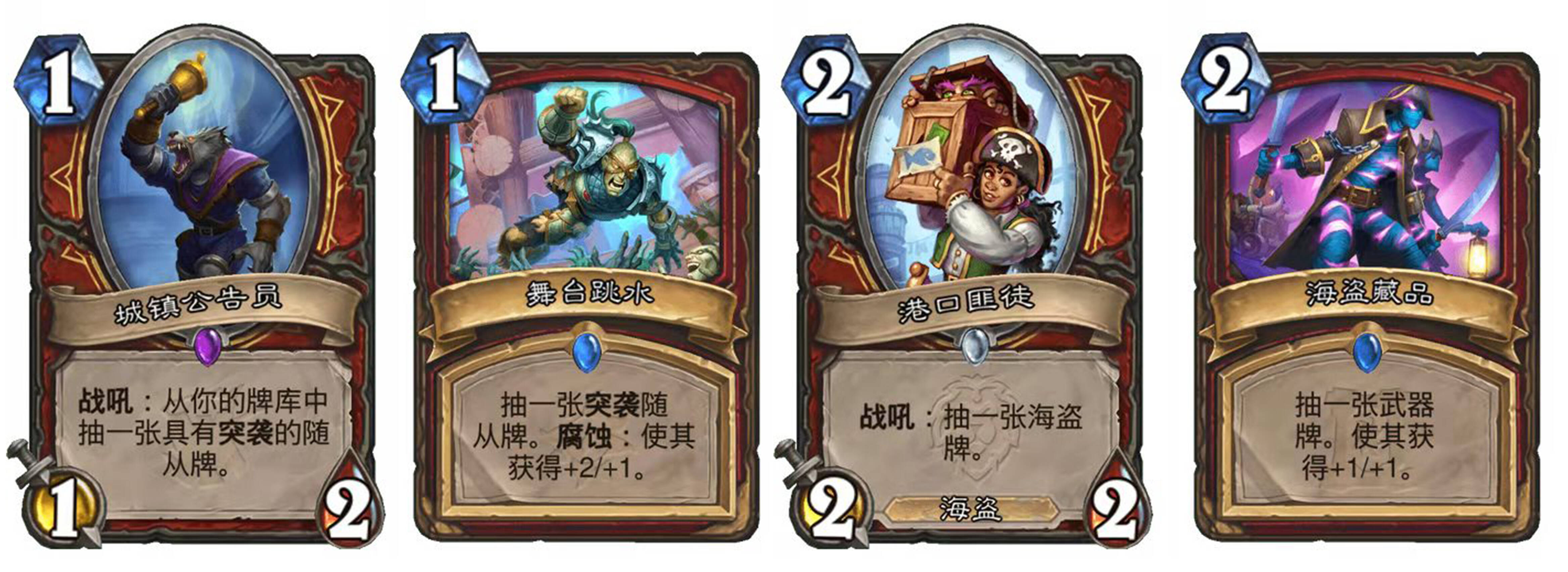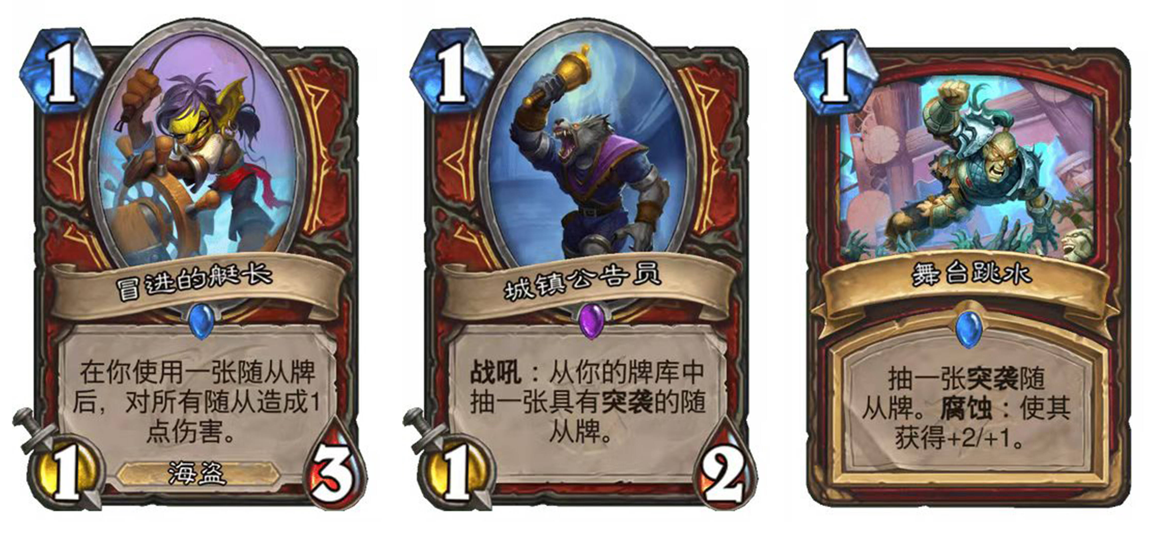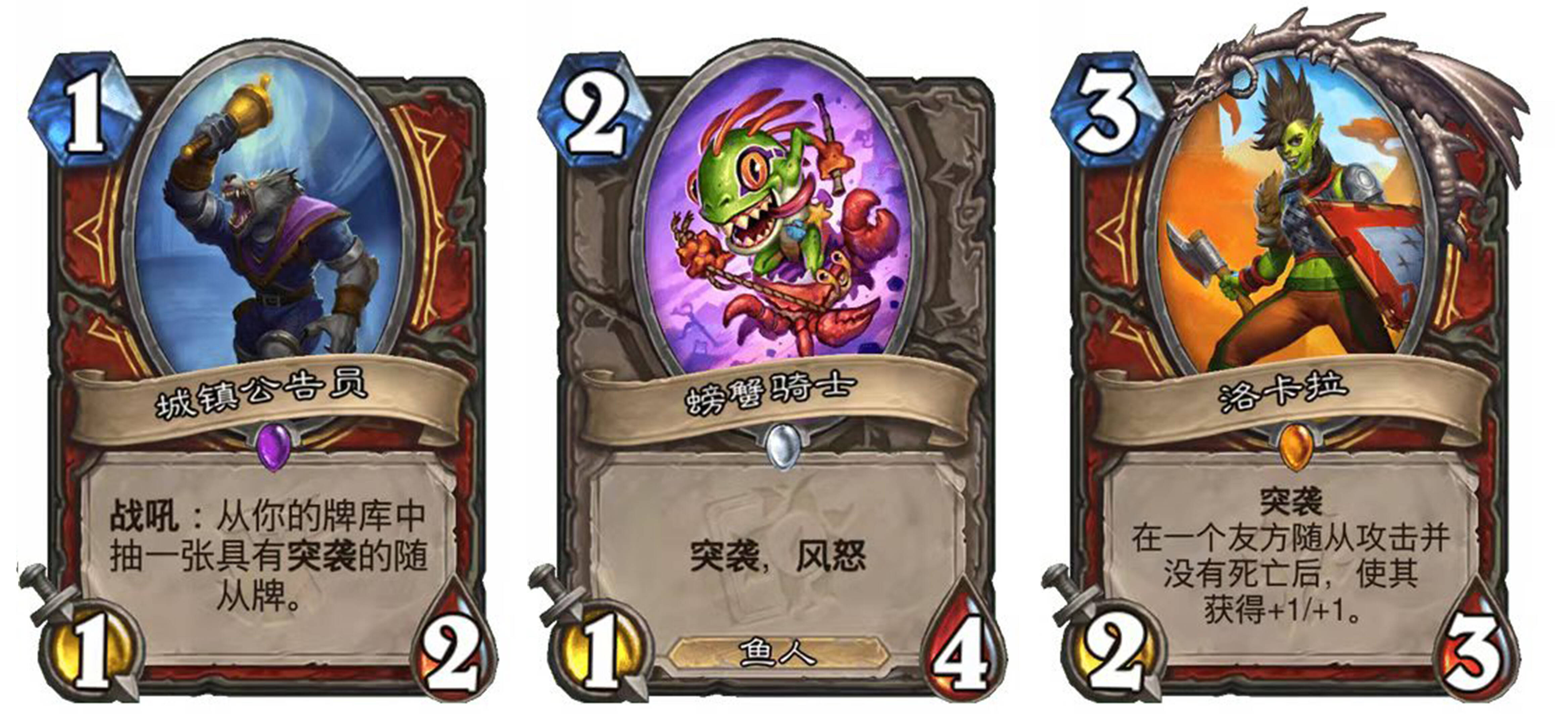 ·城镇公告员:激怒战少有的1费优质随从,最理想情况是检索螃蟹骑士,前期也可充当艇长的弹药打AOE,中期作为多余的费用润滑剂,灵活好用。