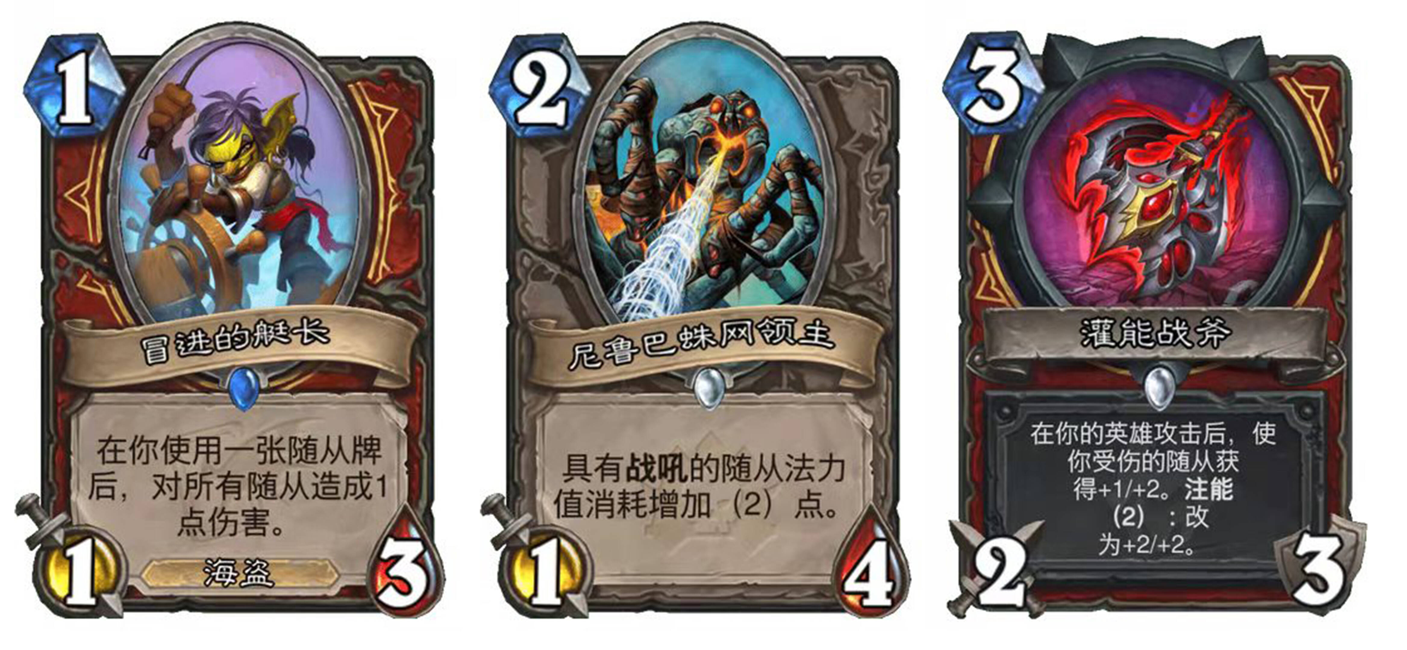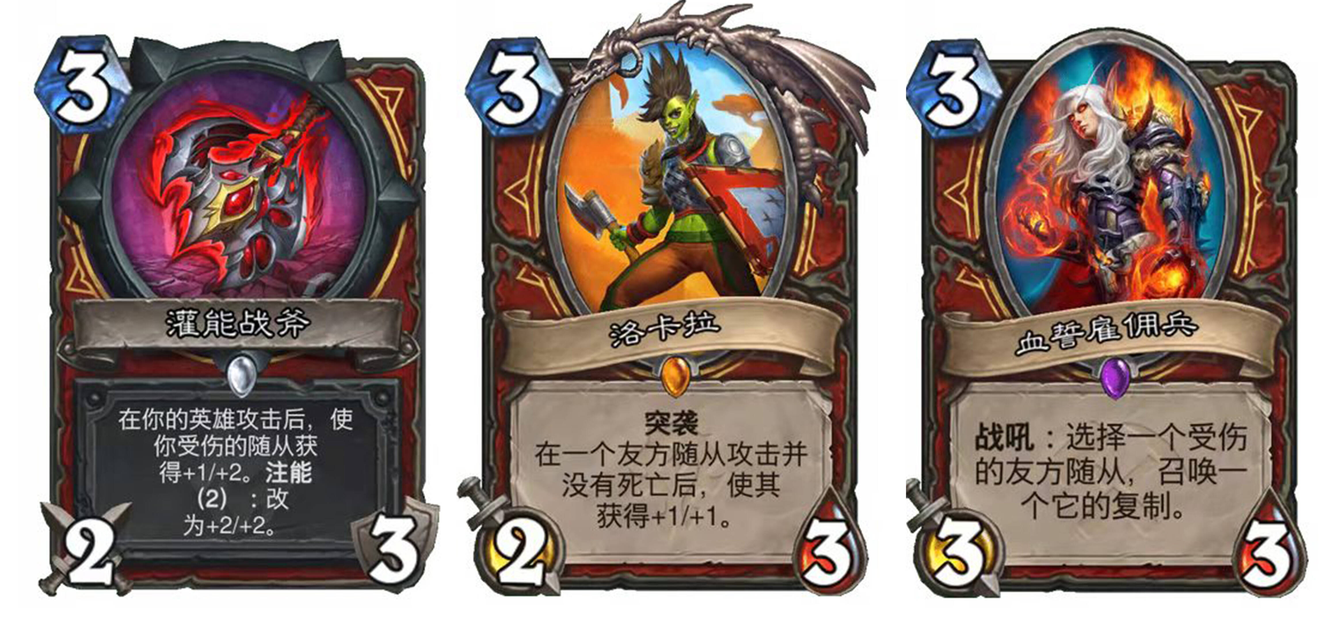 ·灌能战斧:激怒战核心之三,场面强化的放大器,新版本最为重要的补强卡,完美解决激怒随从普遍都是1攻的羸弱场面,注能效果不是关键,前期可利用大屁股随从撞怪受伤再武器buff;满血情况下可以武器砍怪掉血,以便后续战斗怒火抽牌。