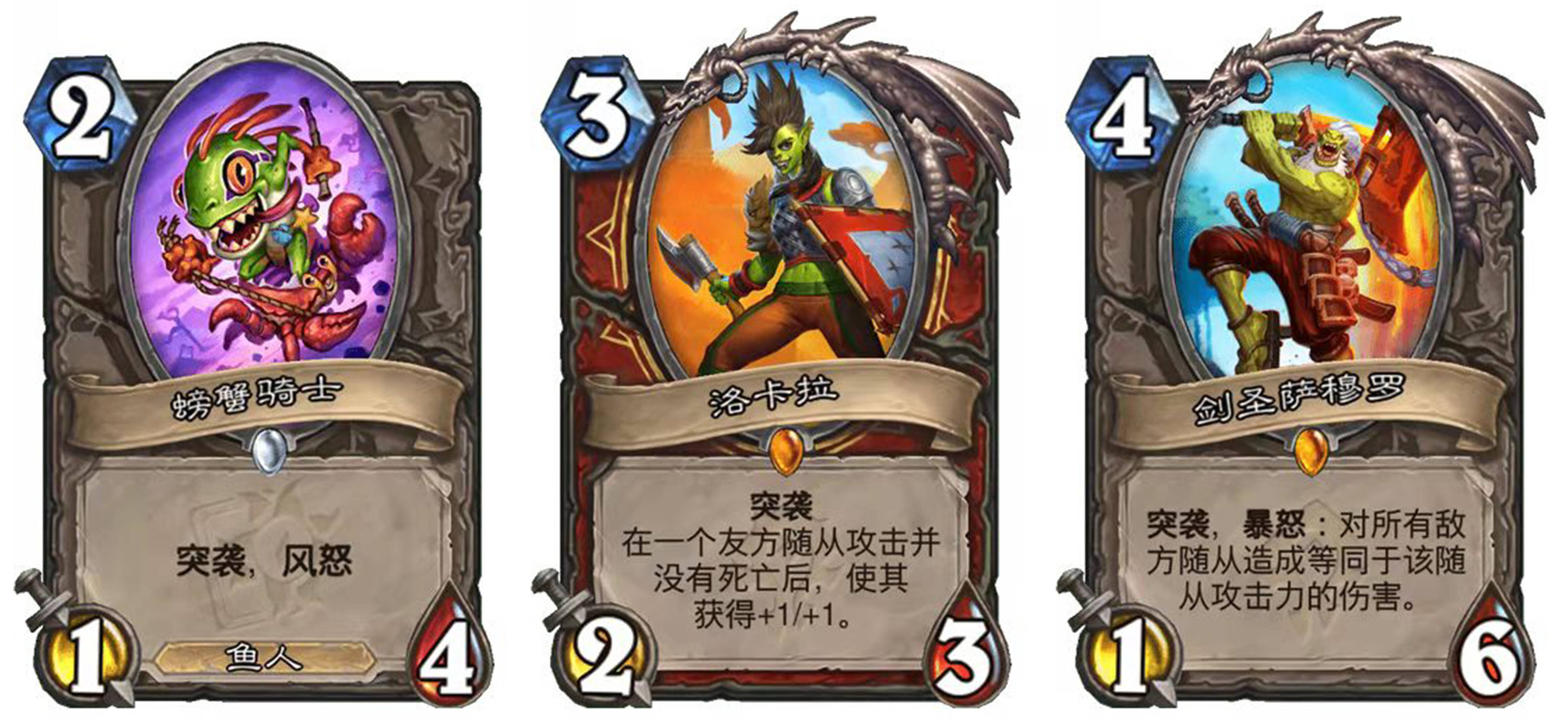 ·螃蟹骑士:优质2费随从,对阵快攻必留卡,突袭风怒完美契合心能提取者和洛卡拉效果,也是地标、荣誉护盾、血誓雇佣兵的优质对象,养起来的风怒螃蟹对于缺乏硬解职业是巨大威胁(如鬼灵贼、海雷贼、开门法)。