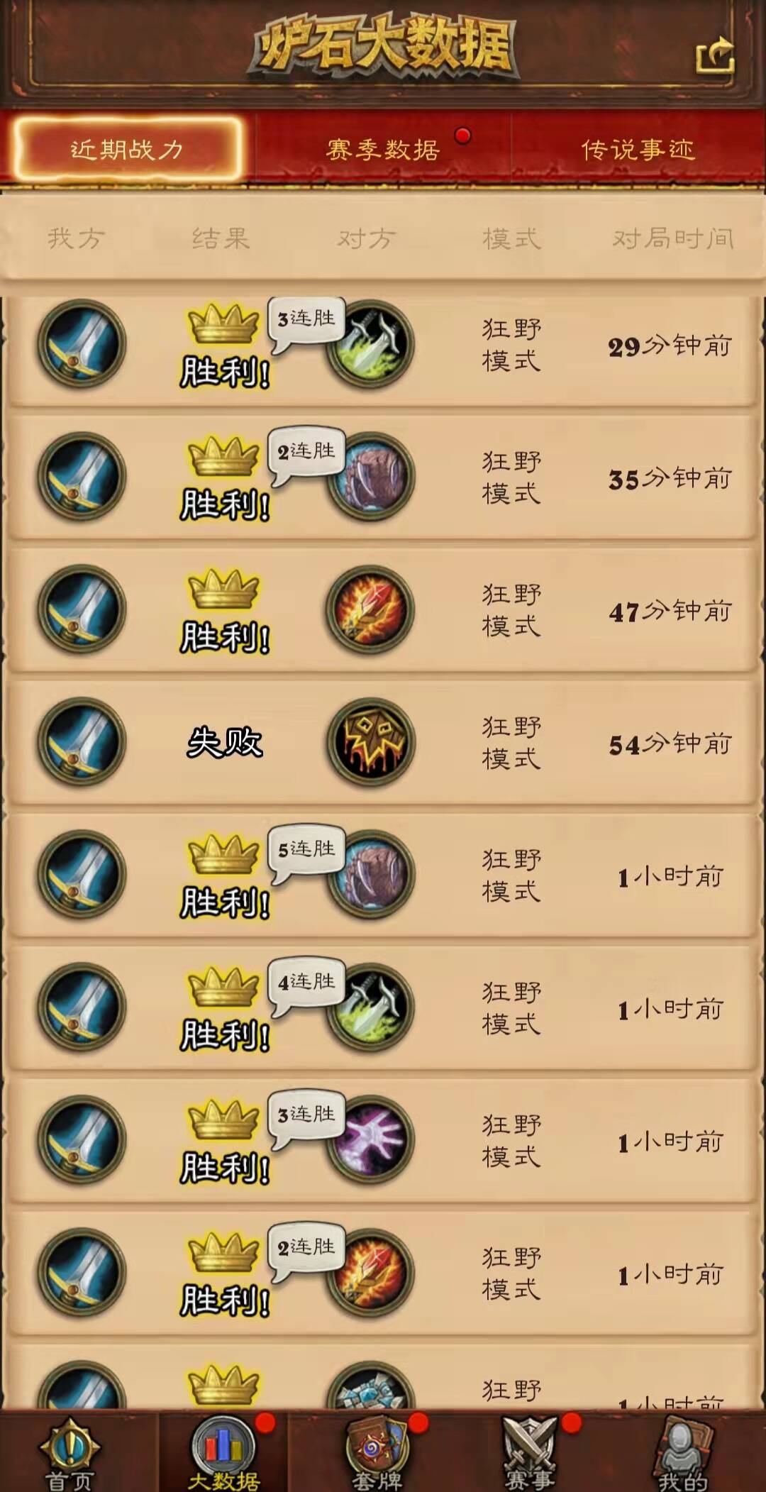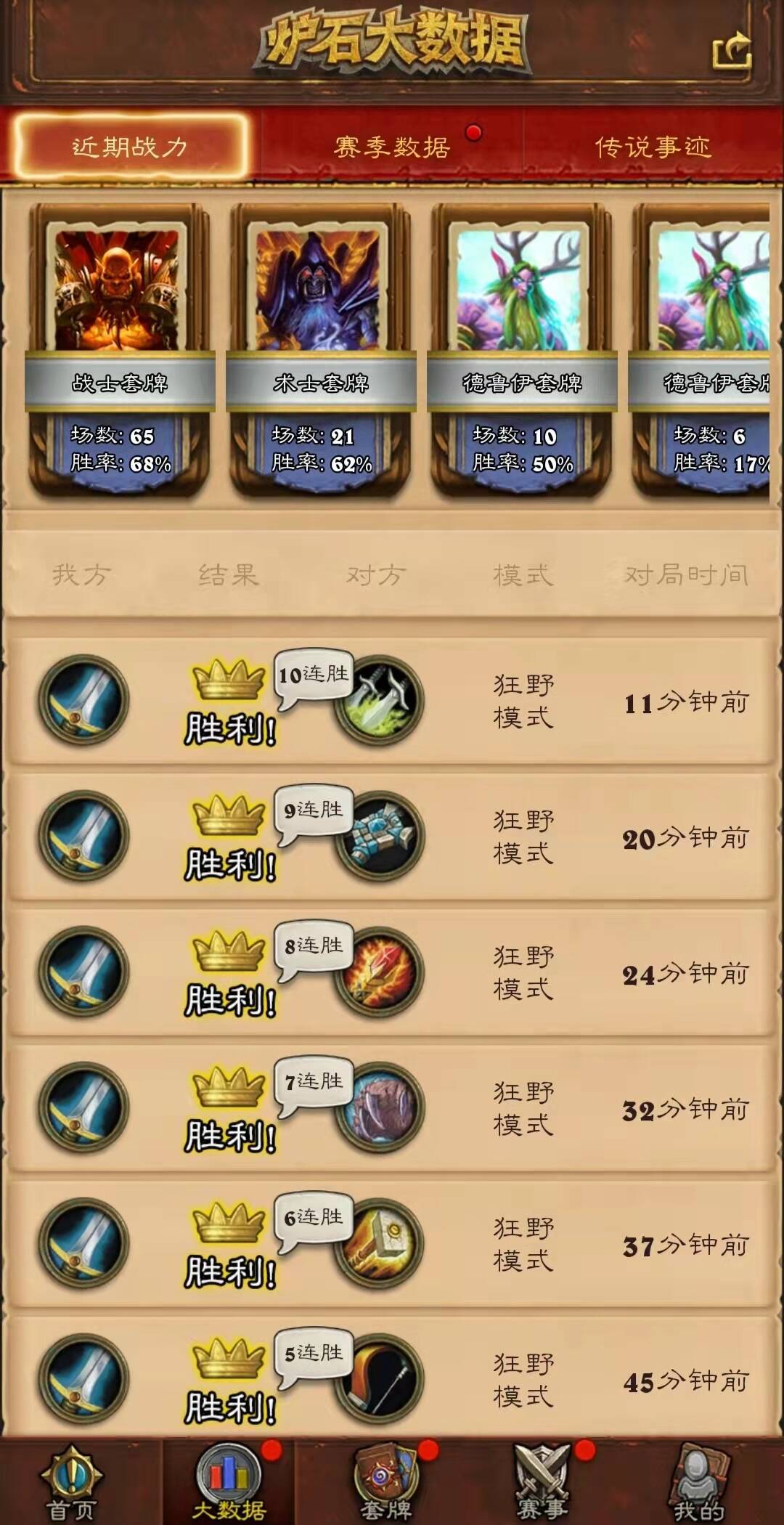 现在直接进入正题,这次上传之旅跟上个月一样,也是10颗星从青铜10开打,全程用激怒战以68局47胜21负(胜率69%)打上传说。迷你包新卡的加入,给狂野沉寂了2个月许久的环境带来不少变化,最直观的体会就是奥秘法和缺德的新贵崛起,牧术萨控制卡组的战略收缩,污手党三兄弟和瞎子则依旧躺平,狂野节奏整体有所提速,具体的环境分析会在下文结合实战数据详细展开。