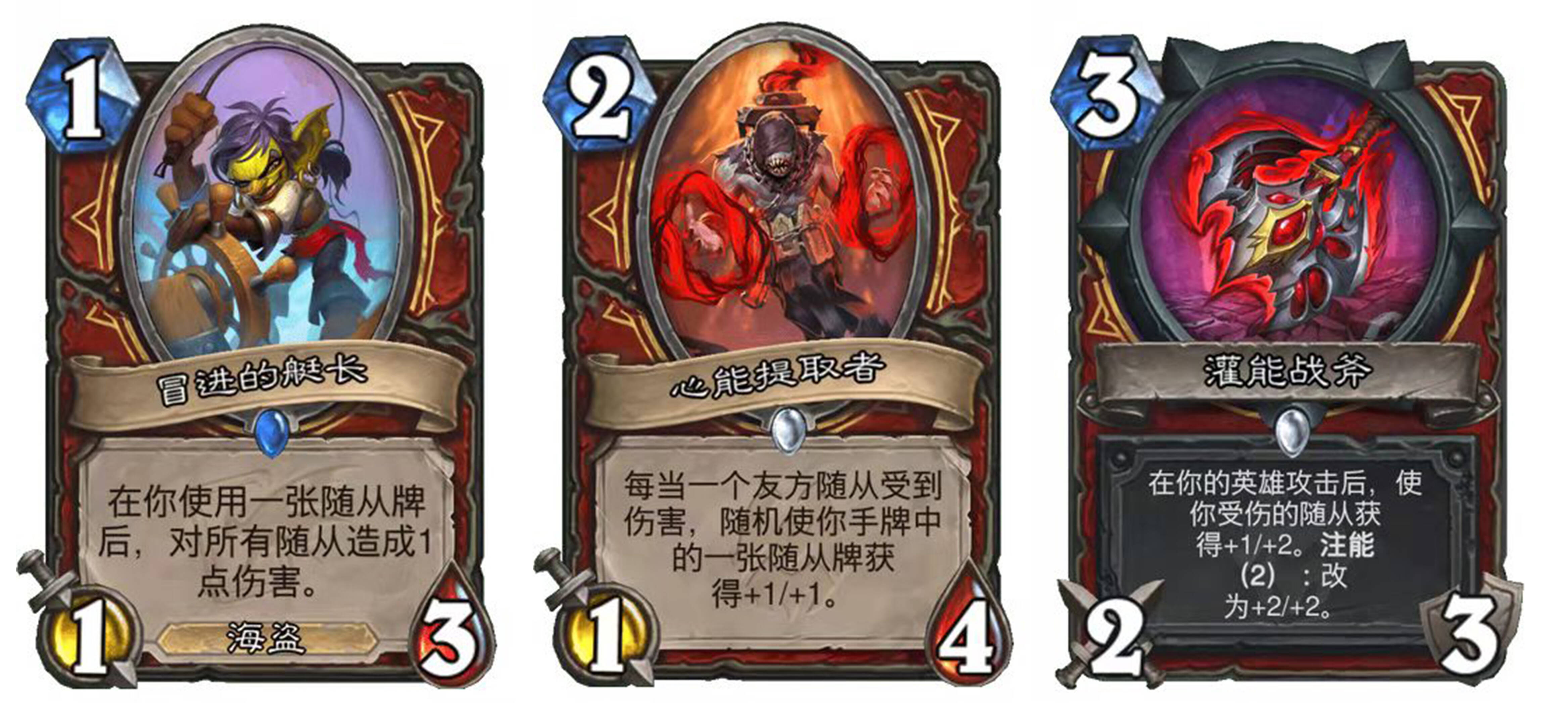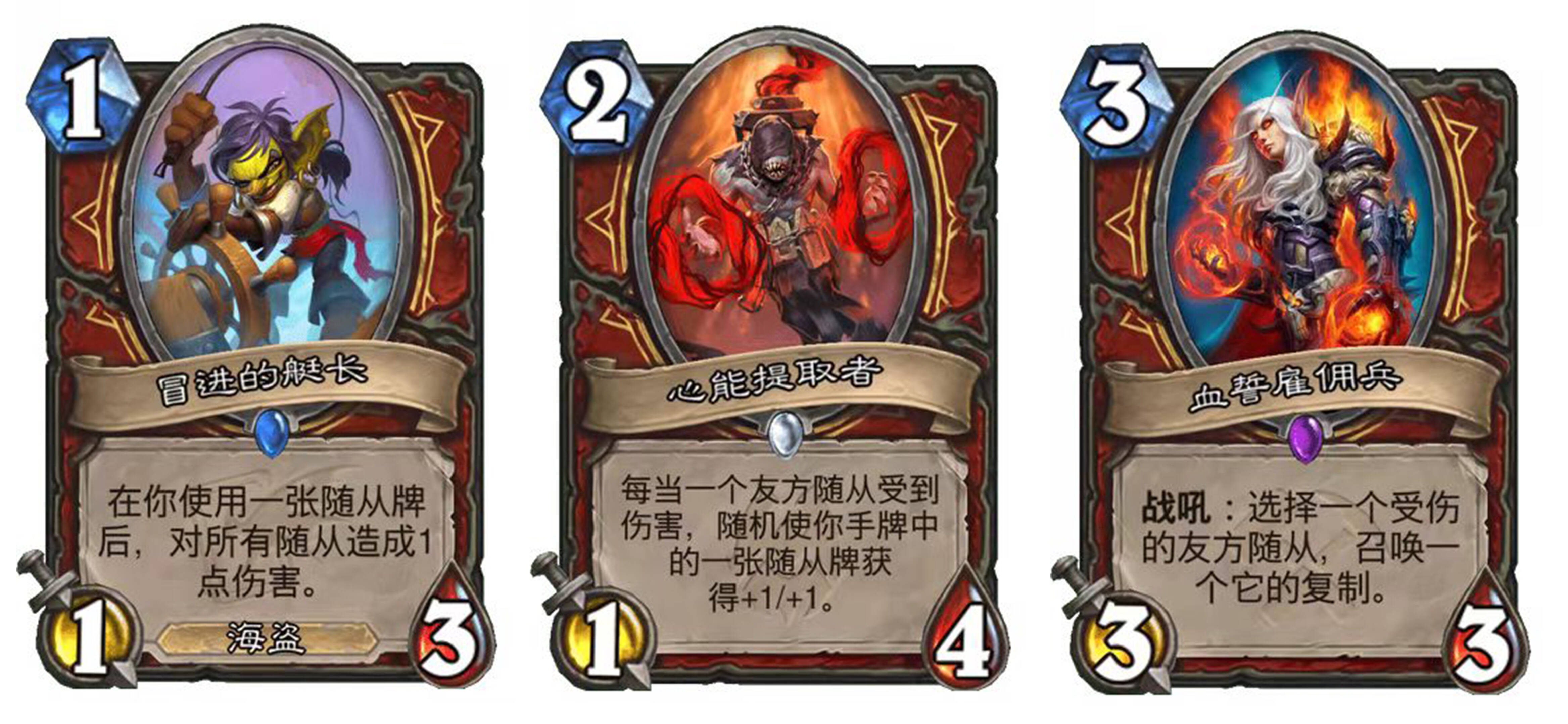 ·血誓雇佣兵:激怒战的万金油单卡,可根据对手情况选择复制对象,打偶数萨3费可复制螃蟹骑士增加解场;打奥秘法、开门法5费可复制尼鲁巴封印随从;打鬼灵贼、海雷贼3费可复制可怜鬼加快抢血;一般对局可复制心能提取者强化随从身材。注意有艇长在场时是先战吼复制再全场打1。