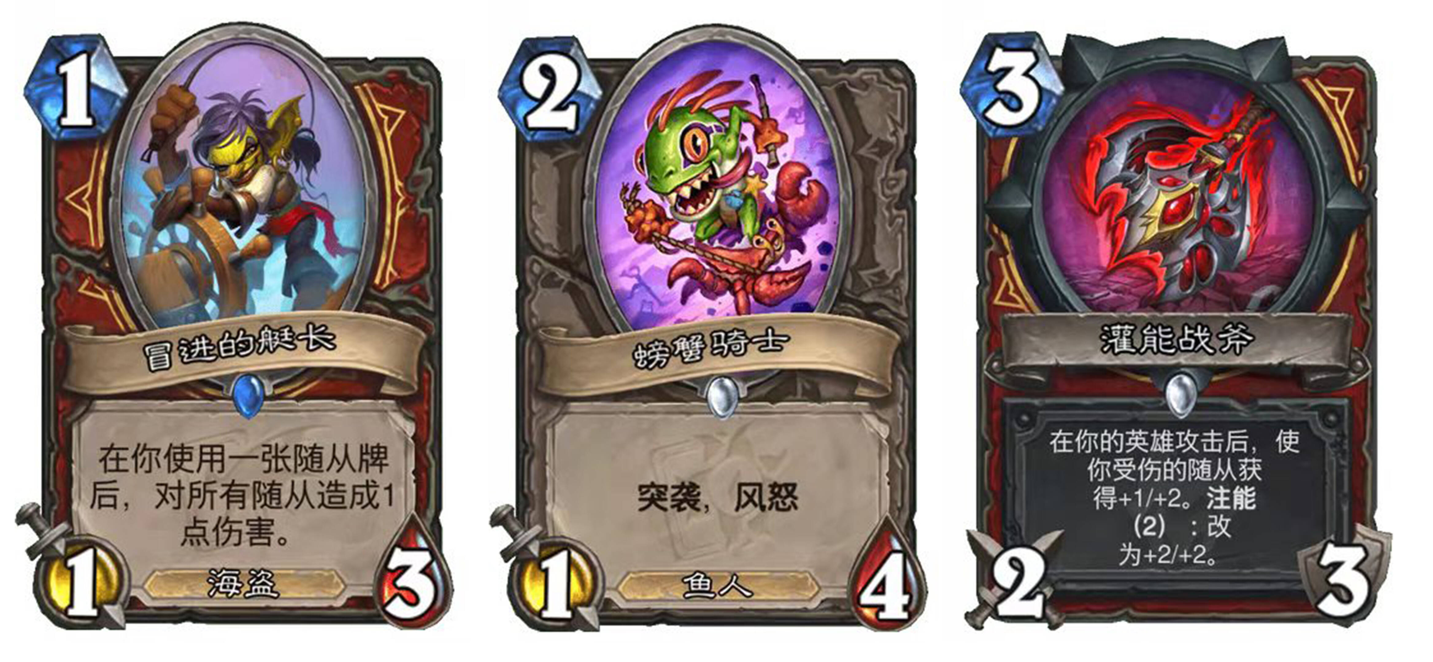 起手留牌主要是考虑对面的开局默认类型(如快攻、中速、组合技),以及激怒战经典“123起手式”(1费艇长+2费随从+3费武器)。