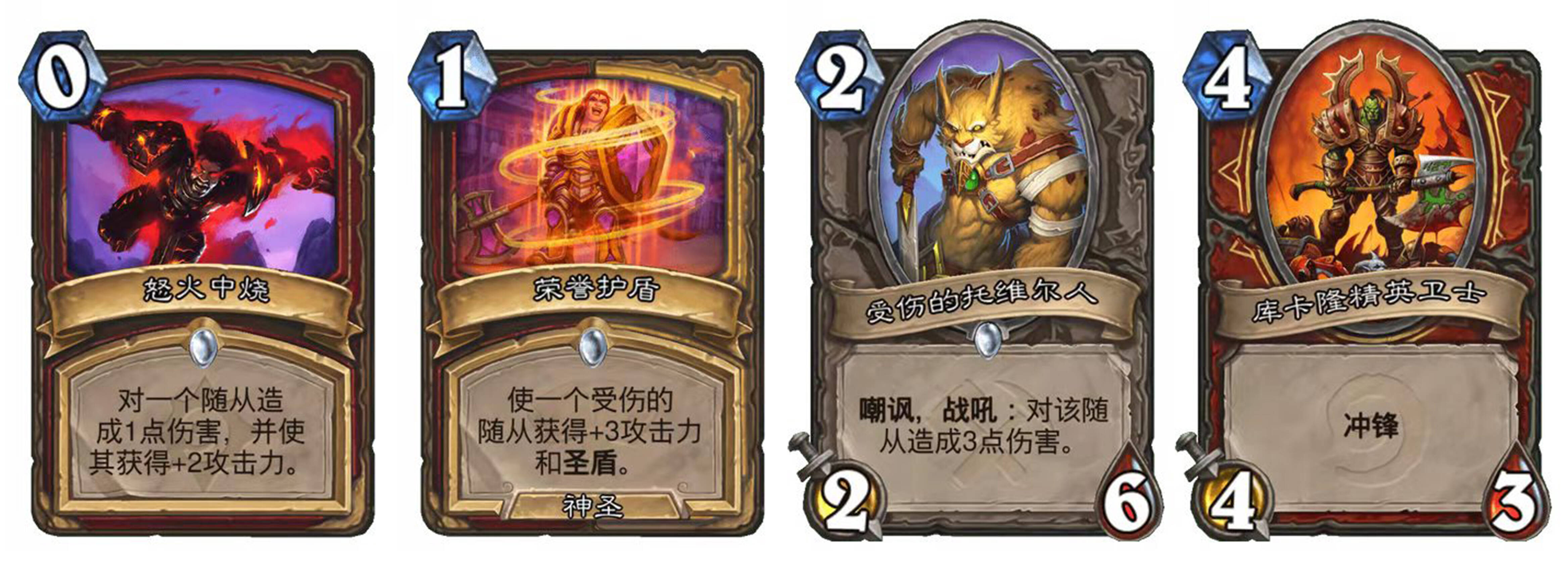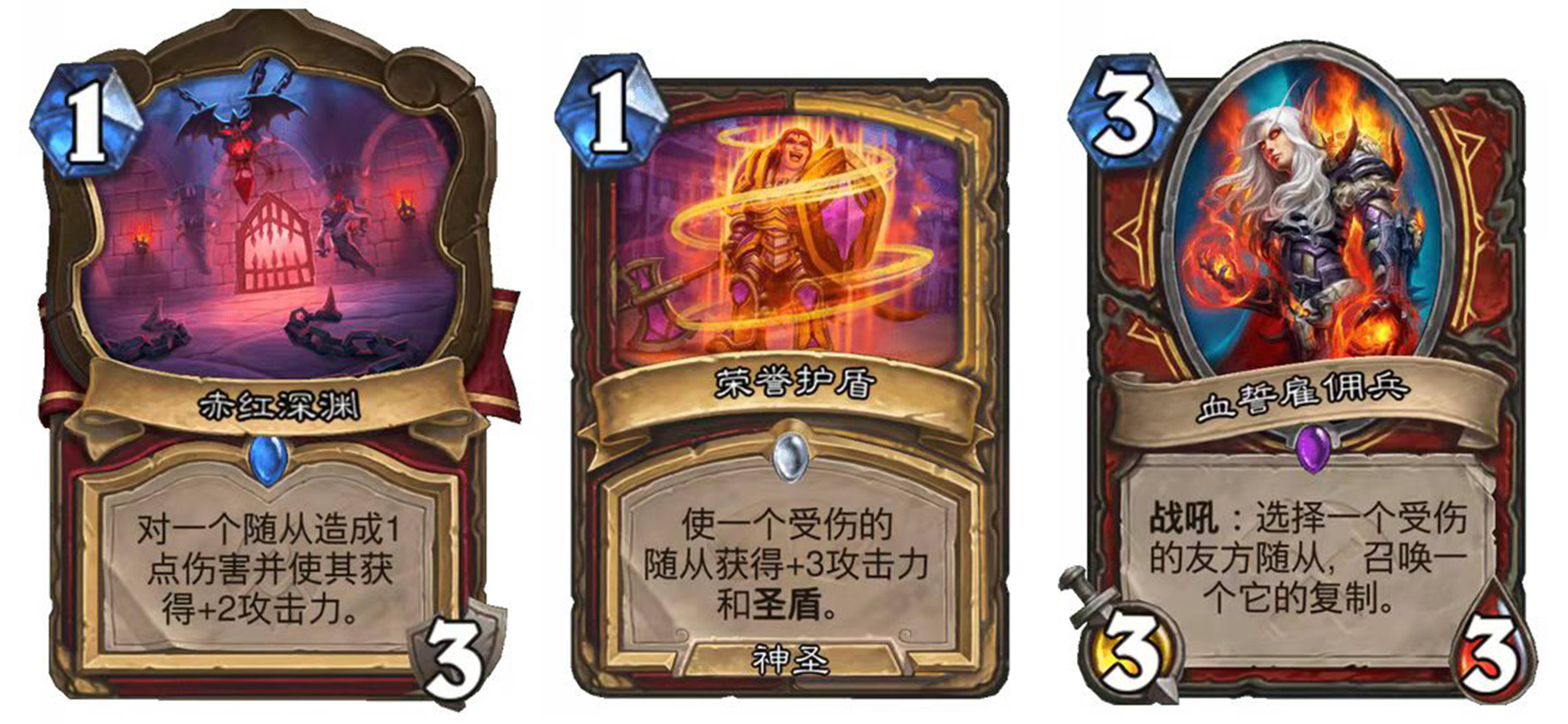 ·荣誉护盾:优质的低费buff牌,配合螃蟹骑士前期可轻易单刷各种贼和德鲁伊,配合可怜鬼、血誓雇佣兵可以打出恐怖伤害,由于有受伤的前置条件,为避免卡手一张即可。