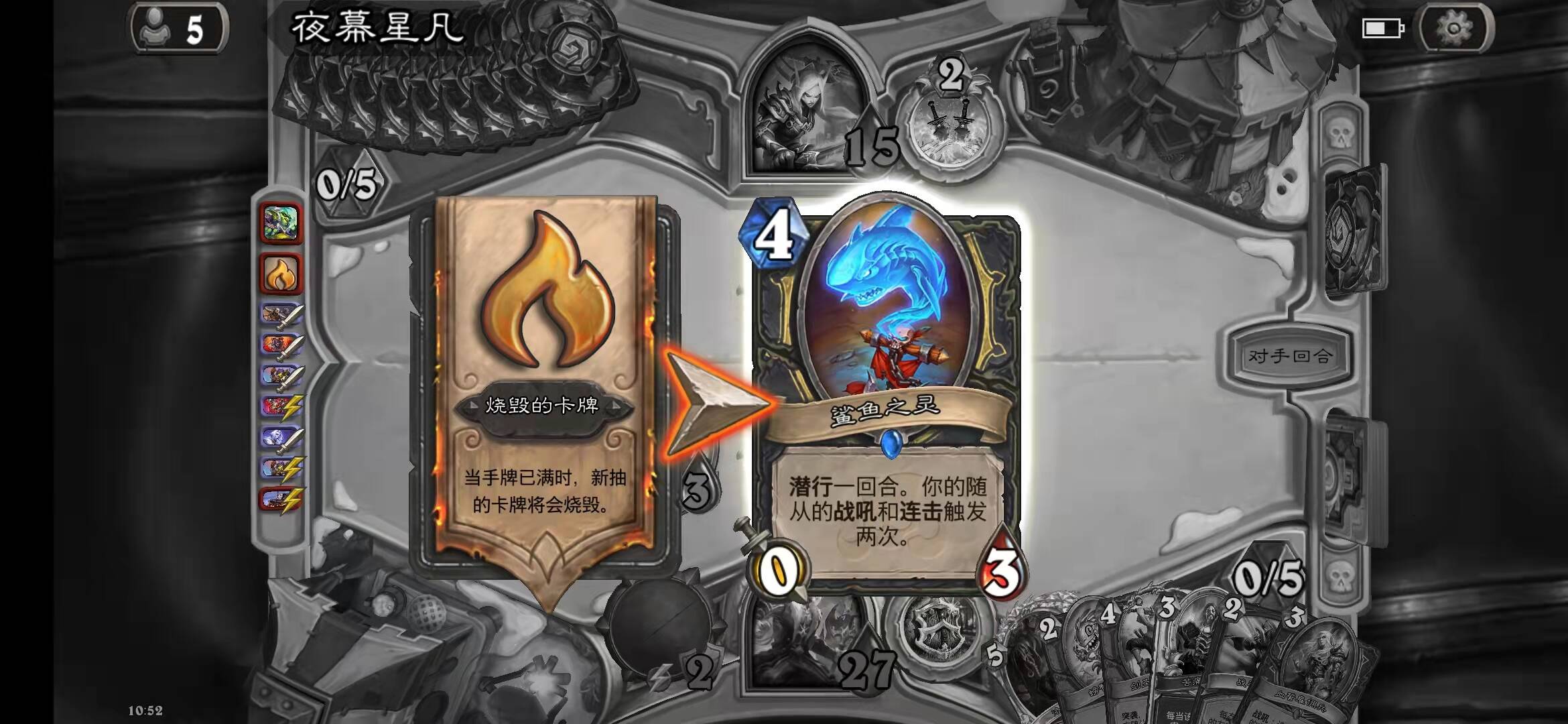 咒鱼术尽管是大劣对局,但当前环境数量有所减少,跟对战宇暗牧一样,打好自身前三回合的节奏,在对手老巨鳍准时上手前尽量多抢血还是有机会拿下的。对战机克术因为有两张火焰灾祸的硬解,建议手里buff起来的大哥不要一次全部丢完,残血的随从及时用武器buff到3血以上防亵渎,防不了的下心能提取者利用亵渎刷buff,同时塞布也是保护场面的一把好手。