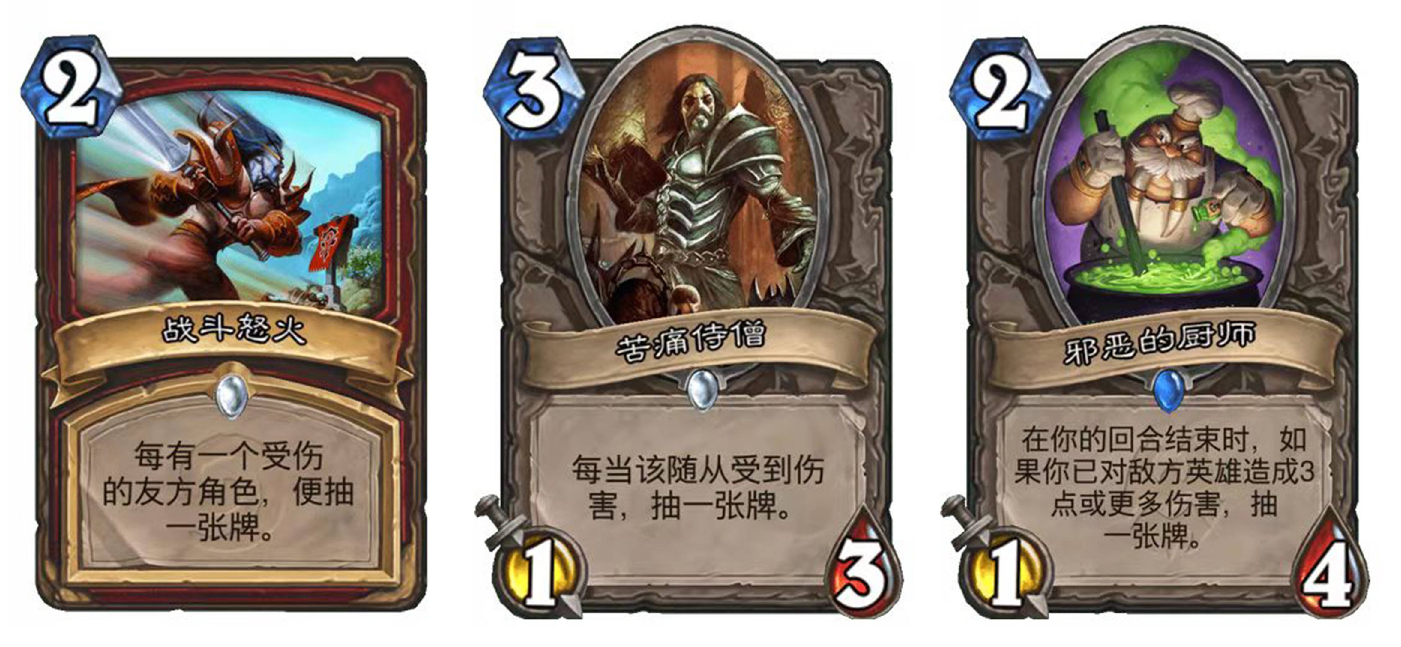 ·战斗怒火:激怒战过牌的保证,2费能过3张就不亏(2费过8不是梦),面对中慢速卡组,尽量在英雄掉血后才叠甲,也可武器砍怪主动掉血。对阵爆牌德时尽量少过牌或者不过牌,因为日蚀+私法程序和自然平衡主动给我们过牌。