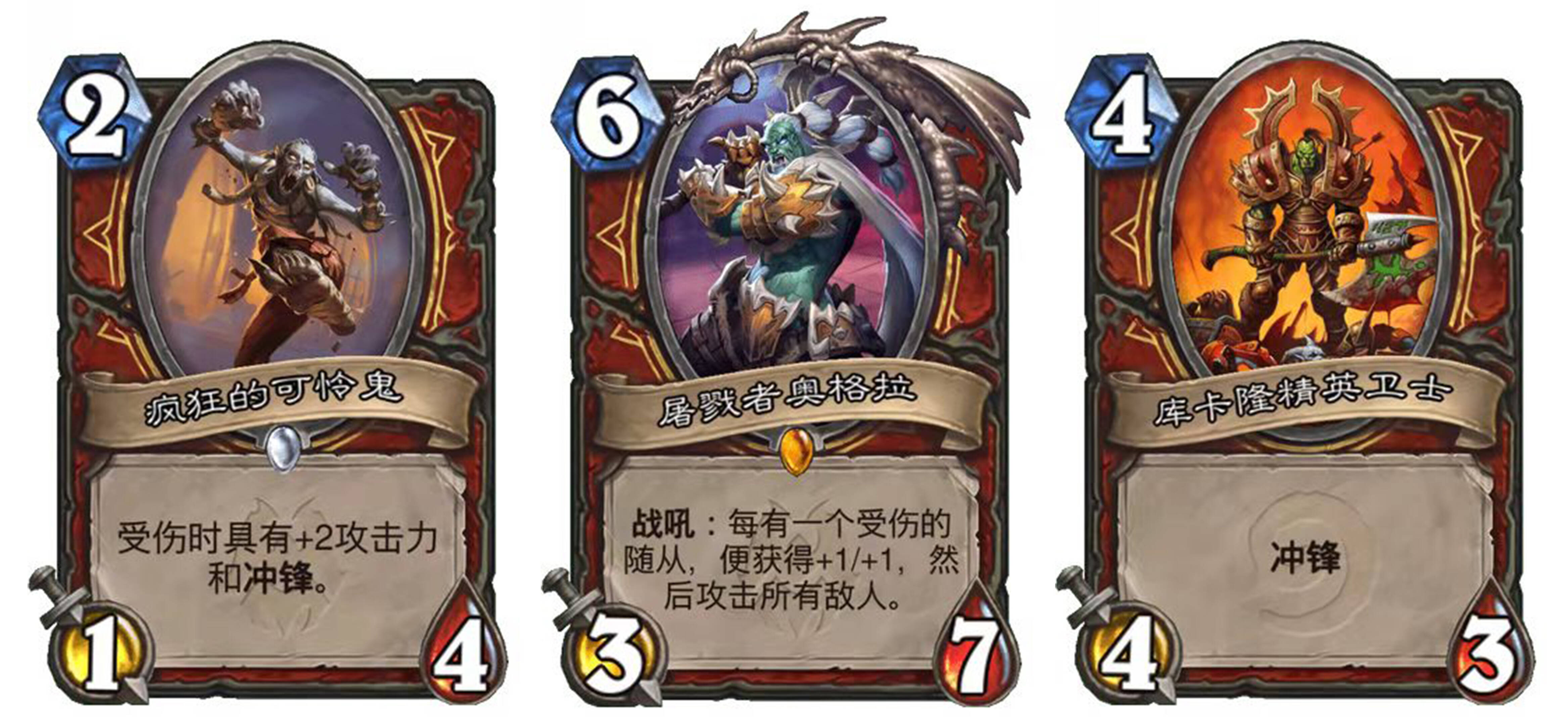 ·屠戮者奥格拉:一般视作一张6费打3的AOE,是心能提取者buff的优质目标,在解鬼灵贼的鲨鱼、偶数萨的图腾、德鲁伊的甲虫时有不错效果,缺点就是比较害怕换手手。
