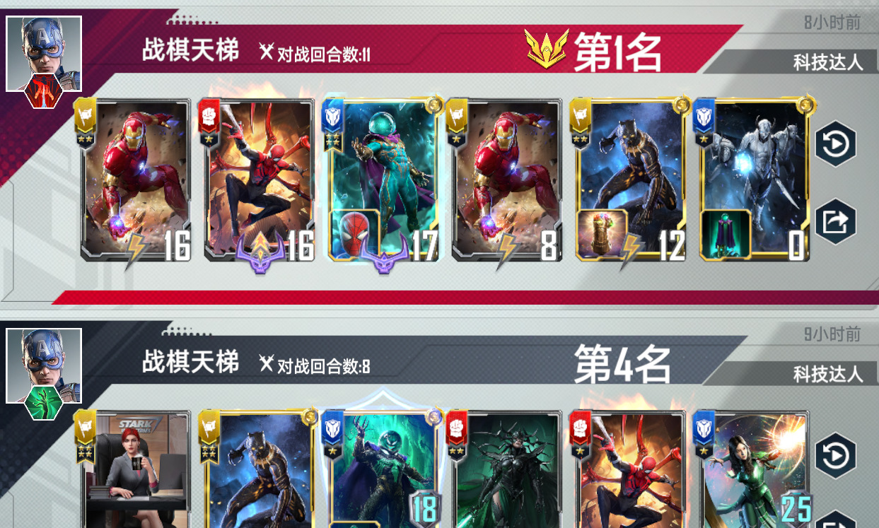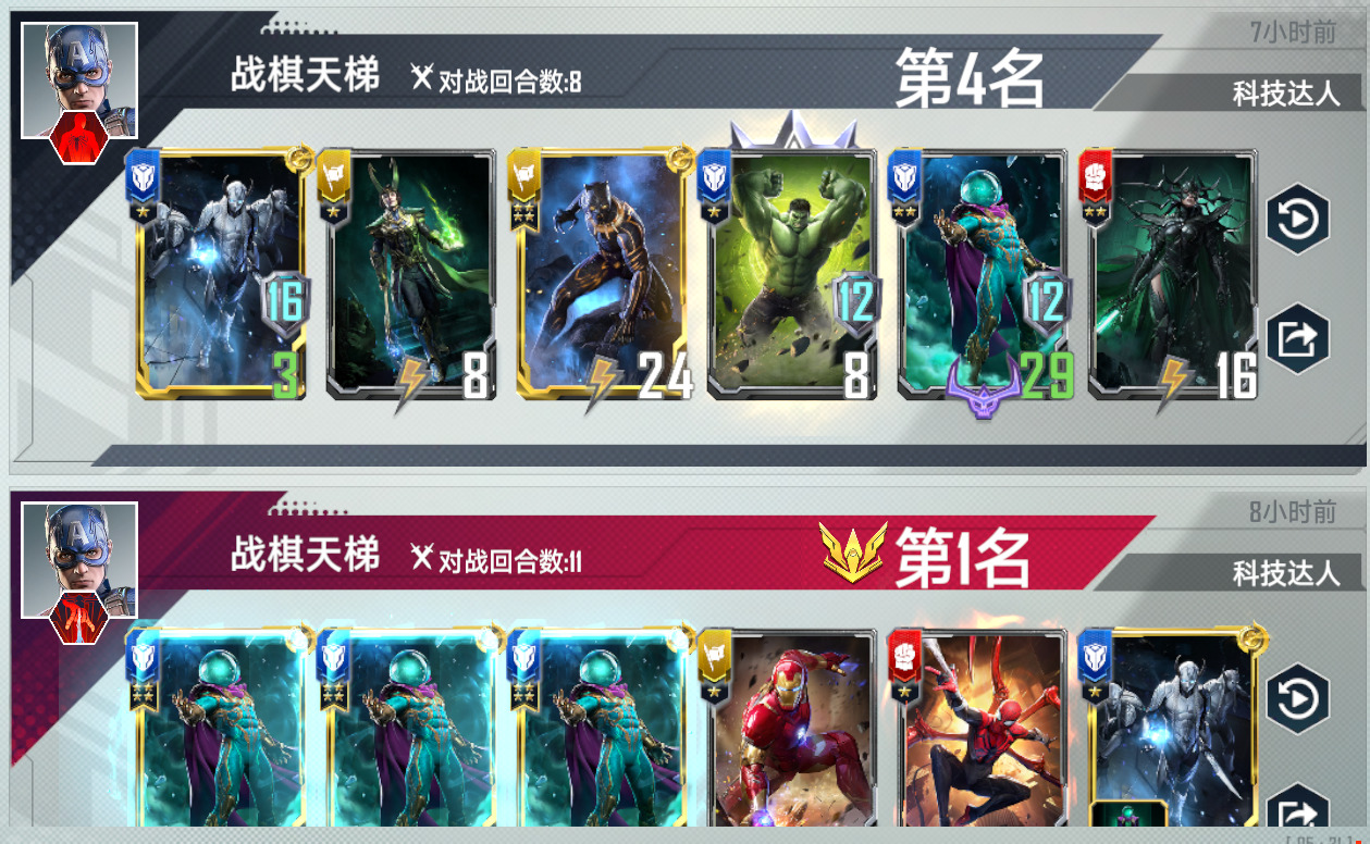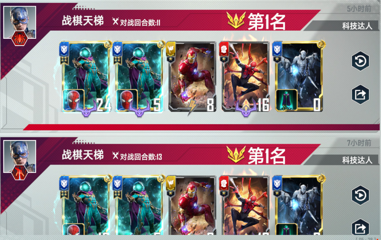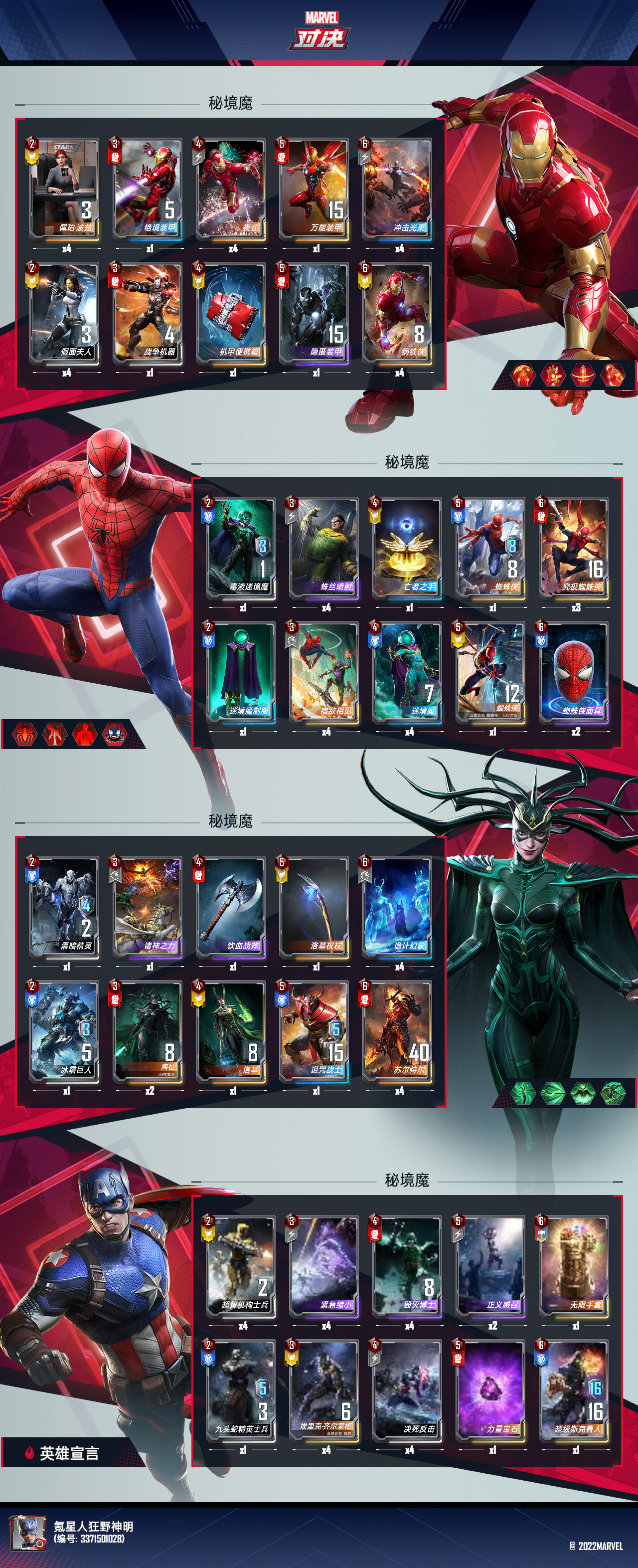 Hello,大家好!我是氪星人狂野神明(ID:3371501028)。这是我第一次在营地上发攻略,我是一个喜欢整活儿的玩家,所以就想着要发一篇娱乐性比较强的卡组。秘境魔卡组可以说是争议非常大的一个卡组,有人喜来有人厌,但不可否认它是漫威对决娱乐性最强的卡组之一。作为一个秘境魔的忠实爱好者,早在诡计幻象修改前的2天,我就在天梯上试着玩大宗师秘境魔。那时我就觉得秘境魔的强度还是不错的,但因为没有幻象加成局限性也很大。新版本更新后,随着超级斯克鲁人的出现,新的幻象秘境魔制造方法诞生了。想必大家也都知道,详情大家可以去参见小Y大神的攻略贴。但想要获得4星幻象秘境魔需要的key牌很多,需要2秘境魔+2超级斯克鲁人+1大宗师+1面具之下,成型难度不小。最近收到我们队妄想大神提供的信息:黑暗精灵可以利用模仿大师护盾来制作幻象秘境魔。结合我之前就有的用浩克制作秘境魔的想法,组了一套新的的秘境魔卡组在天梯上试了一下,成型速度有一定的提升,最终取得了8把6鸡2第四的战绩。让我觉得这个娱乐卡组届的大咖又回来了,下面是战绩图。