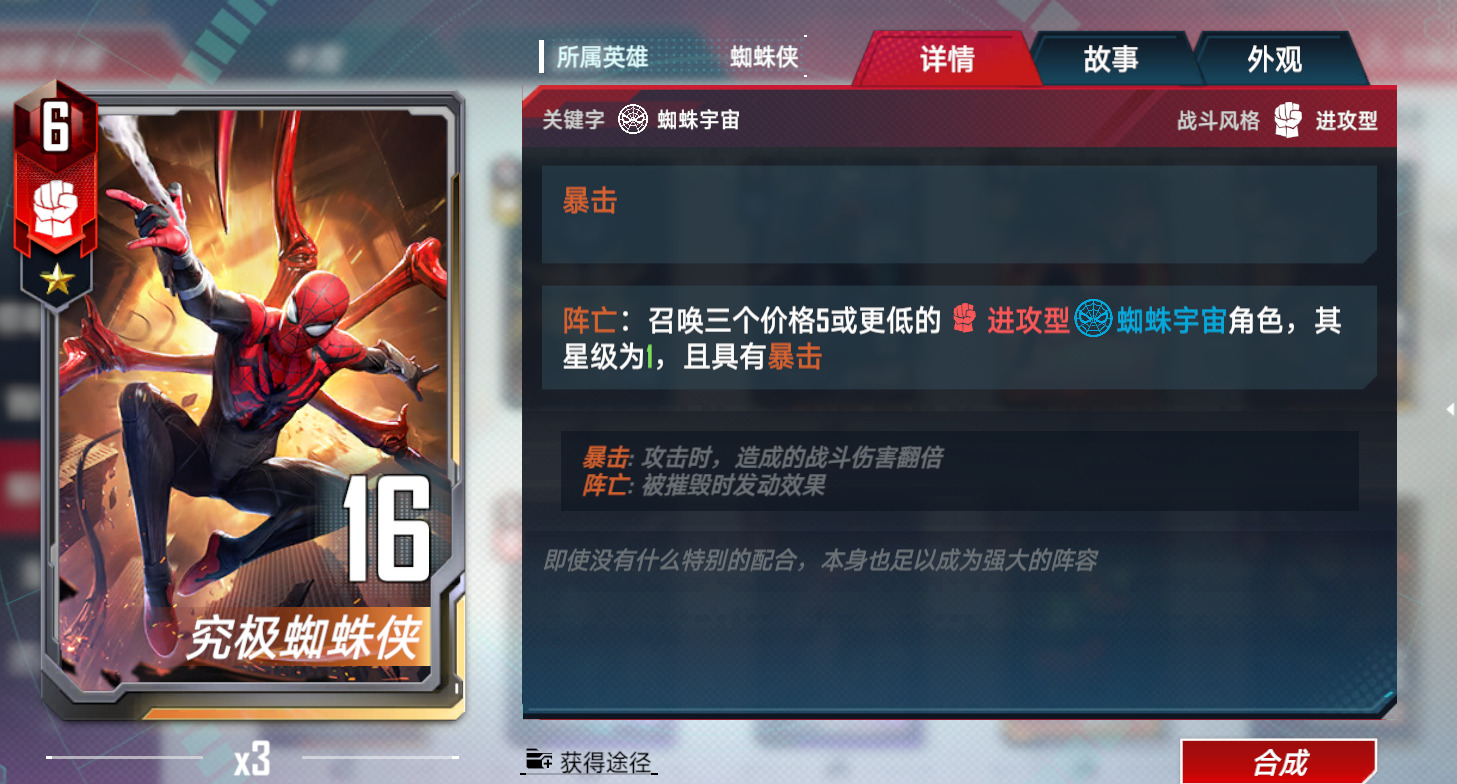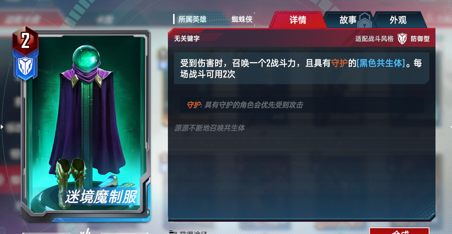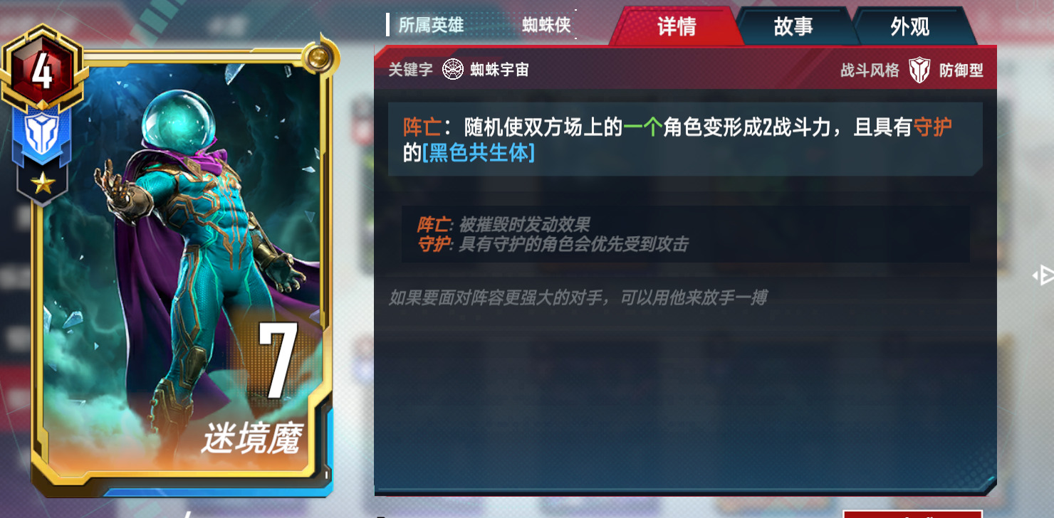究极蜘蛛侠可以让我方场上角色减员速度降低,减缓诡计幻象触发时间,配合携带蜘蛛侠面具的秘境魔有机会多次触发场上秘境魔阵亡效果,提高诡计幻象利用率。同时可以防止在没有毁灭博士时被清屏,以及降低毁灭博士出去后被2次清屏的可能性。在面对蜘蛛瑟希卡组的时候还可以通过夜巡究极蜘蛛侠**提升对战胜率。带3张主要是为了夜巡,理论上1张即可,站两个性价比没有钢铁侠高,除非没有其他key牌需求了,经济富裕。