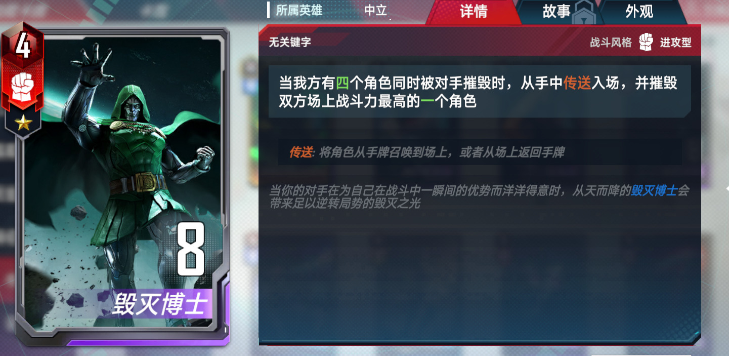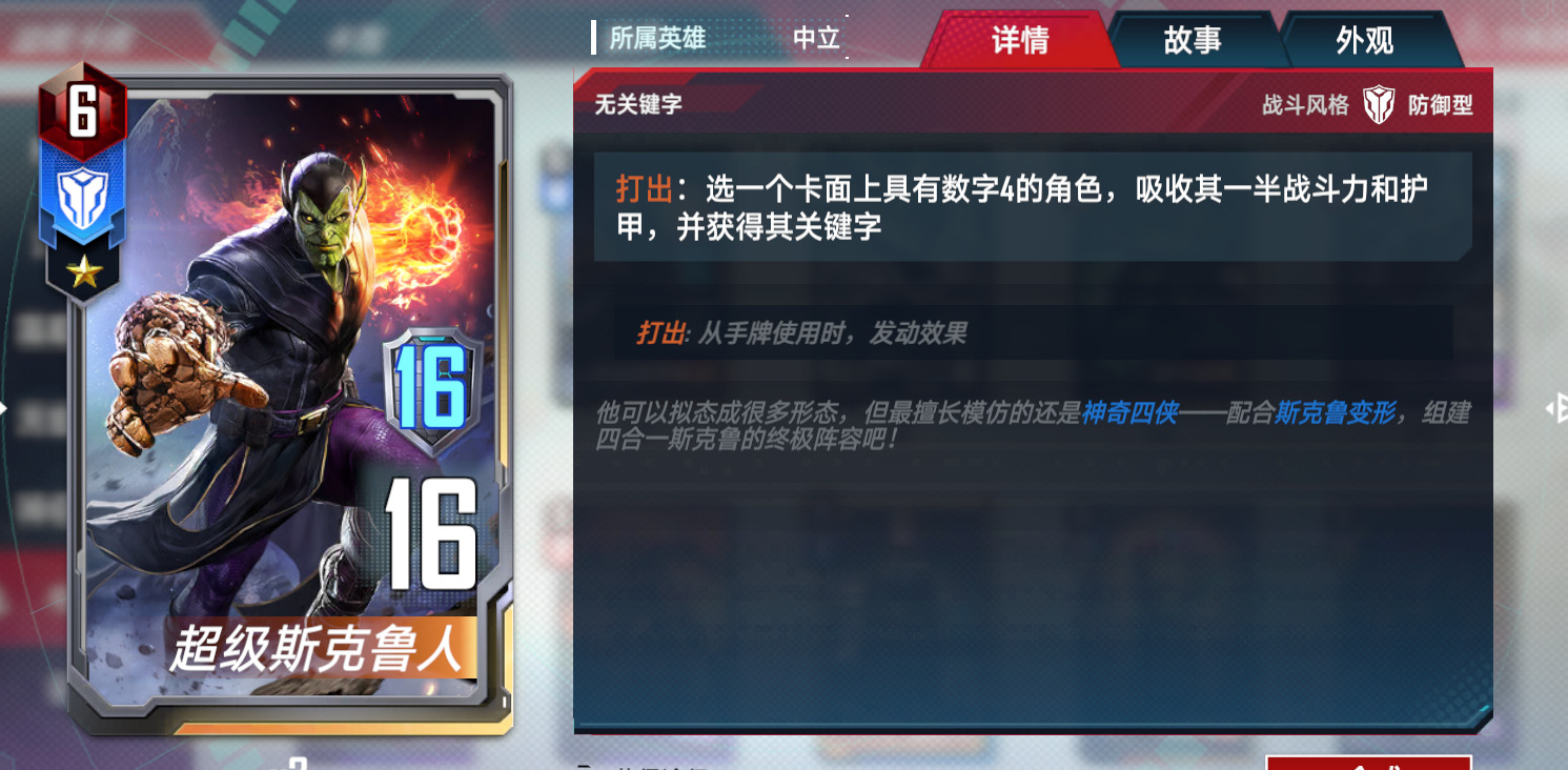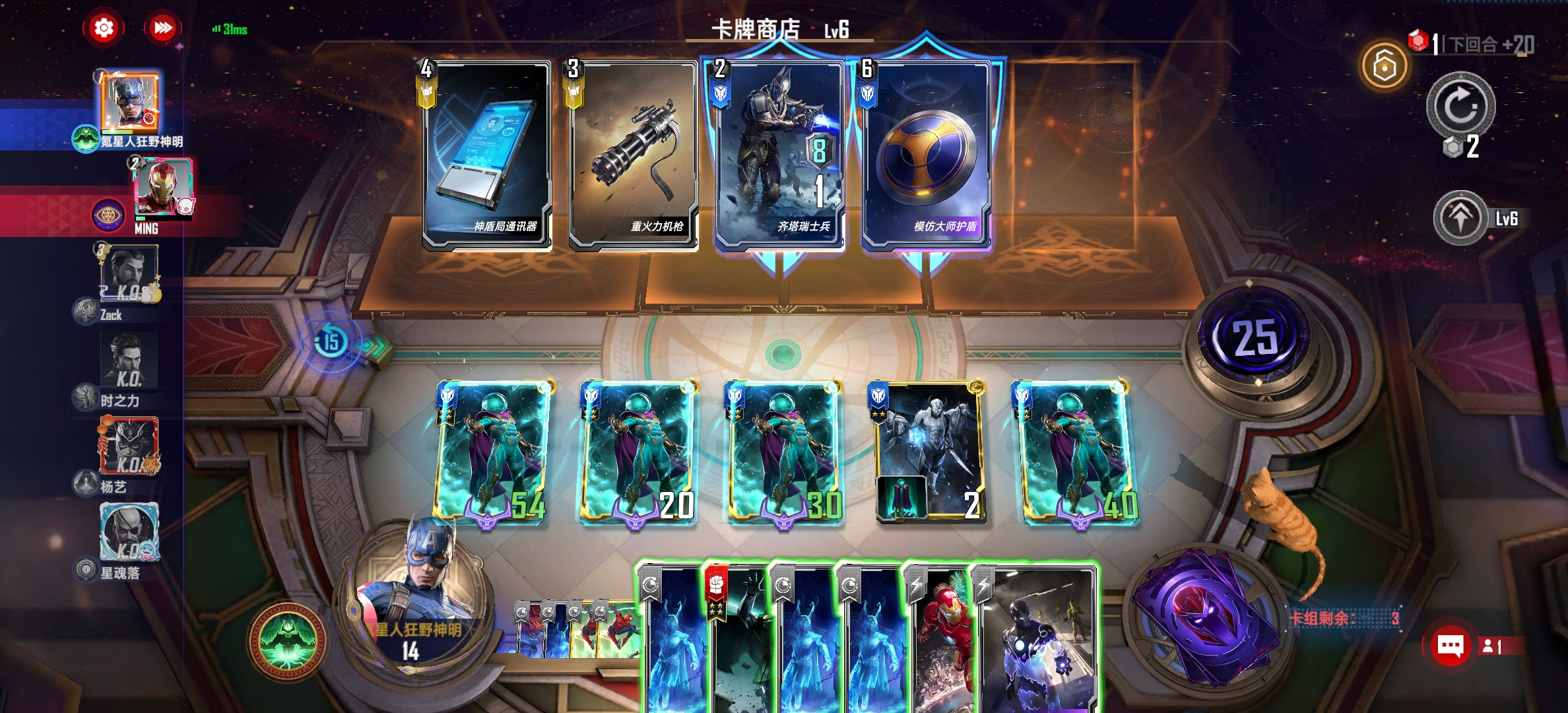 上6之后只要搜到一张超级斯克鲁人+模仿大师护盾+浩克等key牌就能马上造成4星幻象秘境魔,成型速度还是不错的。一般9回合4星幻象秘境魔加1-2张诡计幻象是正常节奏,顺的8回合能成型,前面那个7回合成型应该是极限了。之后就可以根据场上卡组情况选择是否购买毁灭博士,这期间主要还是搜诡计幻象为主,有2-3张后就可以考虑买钢铁侠,究极蜘蛛侠等增加战力的牌,或者拿浩克继续造幻象秘境魔。当然,虽然我们可以通过浩克来获得幻象秘境魔大军,但我其实不是特别推荐制作太多幻象秘境魔的,一方面幻象的数量与战力不是成线性关系的,还会占用其他战力牌的位置。同时容易被一个射线清屏。所以,2个4星秘境魔其实就够用了的。