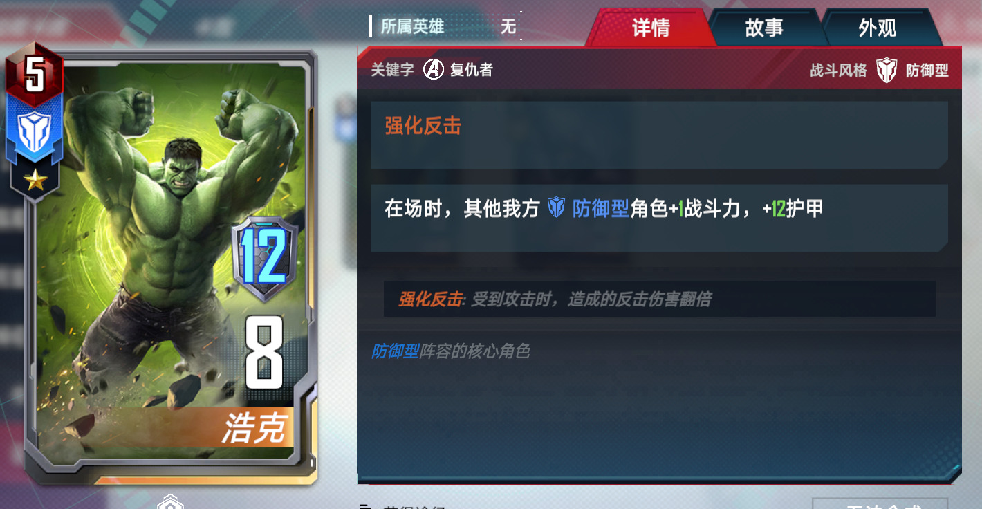 目前我带一张,目的是为了增加前期其他经济血量牌的搜牌效率,一旦上场就下不来了,所以能不上场尽量不上场。对于前期的处理要求高一点,但后面通过各种方式给它加功来制作幻象秘境魔方法的选择更多。如果带2的话,一旦合成2星,虽然战力能直接达到4,但一开始就不能通过浩克来制作了,只能用模仿大师护盾来制作幻象秘境魔,且不能挂宿敌相见事件。当然护甲减为0后还是可以留在场上用浩克来制作更多的幻象秘境魔的。根据大家喜好选择带1还是带2。