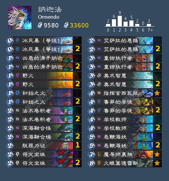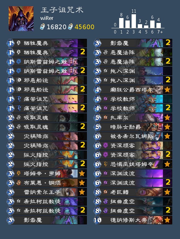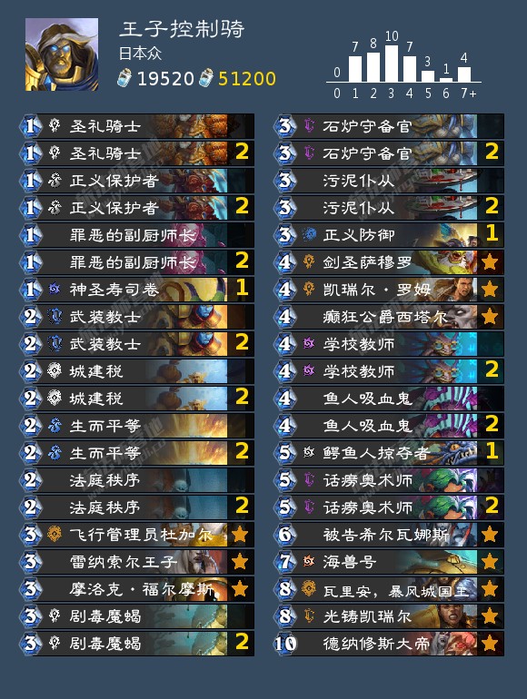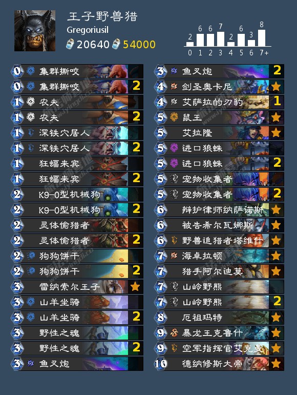 单卡层面,这次比赛的新贵似乎是费林大使,他较多地出现在野兽猎里(非王子里甚至比王子里还多),少量大奖贼和控制骑里也有。纵火指控也在各种形态的术士里都有出现。