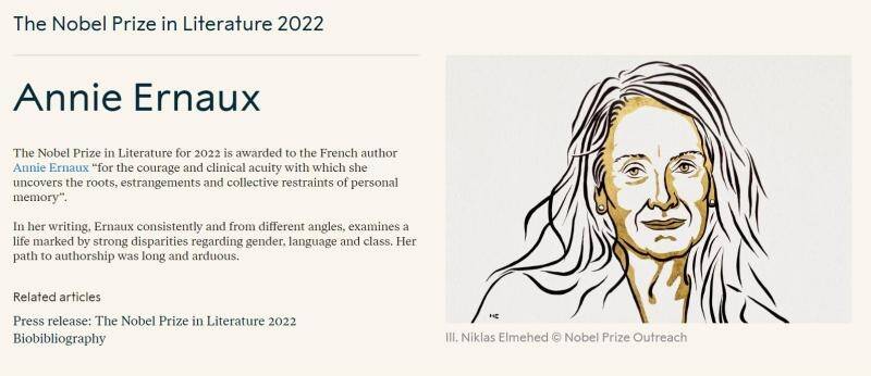 10月以来,2022年的诺贝尔奖陆续公布,生理或医学奖、物理学奖之前已经公布,今天晚上文学奖也公布了,瑞典文学院在斯德哥尔摩宣布,将2022年诺贝尔文学奖授予法国作家安妮·埃尔诺(Annie Ernaux),以表彰其在文学上的成就。