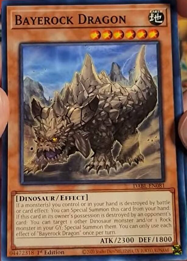 自己手卡·场上的怪兽被战斗·效果破坏的场合:可以从手卡把这张卡特殊召唤。这张卡被对方破坏的场合:可以以这张卡以外的,自己墓地的恐龙族·岩石族怪兽最多2只为对象(相同种族最多1只);那些怪兽特殊召唤。“Bayerock Dragon”的每个效果1回合各能使用1次。