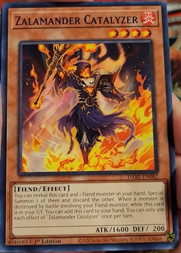 可以把手卡的这张卡和其他1只恶魔族怪兽给对方出示:那之内的1只特殊召唤,另1只丢弃。这张卡在墓地存在,自己的恶魔族怪兽战斗破坏怪兽时:可以把这张卡加入手卡。“Zalamander Catalyzer”的每个效果1回合各能使用1次。