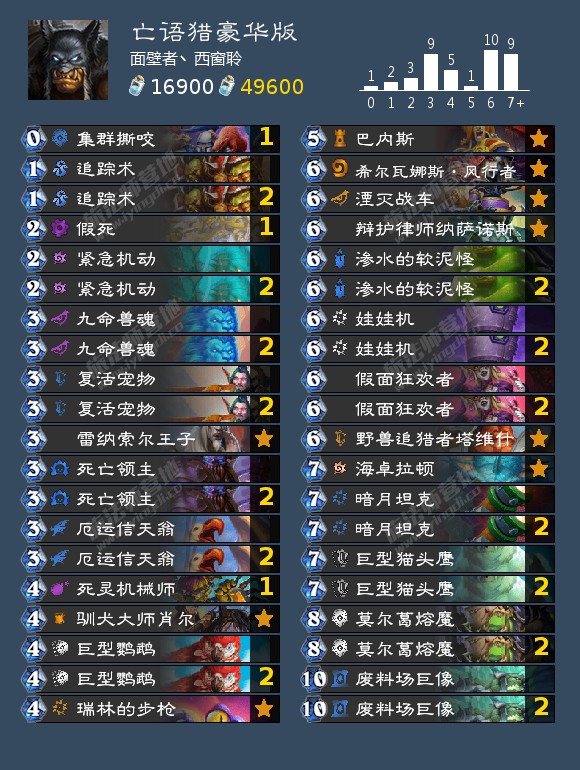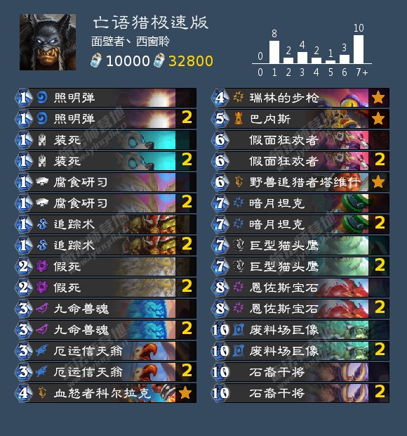 今天终于又有机会再给大家发卡组了,本期的卡组是:亡语猎,说到“亡语猎”大家第一时间想到的一定是对决模式,天梯上几乎是没有的,因此也绝少有人做攻略,所以很多喜欢玩黑科技,但是又没有时间研究卡组的玩家即使想玩也无从玩起。正好最近出的迷你包的新卡里就有一张亡语猎的新卡,聆宝就想开发一下它,供广大炉友娱乐之用,卡组如下: