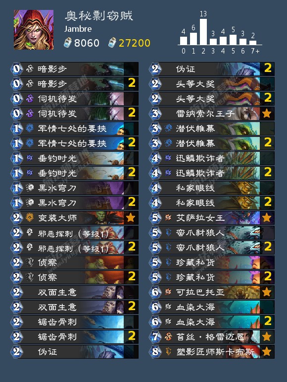 前两天卡组名字写错了,这次真的是奥秘剽窃贼了。不过也只是在构筑上做了稍许创新,也不算什么很新的思路,最大的构筑特色是放弃了部分单卡带上了盗贼的奥秘体系,前期能用连击打出私家眼线还是很超模的,这个卡组的奥秘只选择了能干扰对手的伪证和过牌的双面生意,我自己玩的时候射手奥秘多了会出现拉不出来奥秘的情况,不过不关键,一局能打出一次私家眼线基本上就值回票价了。