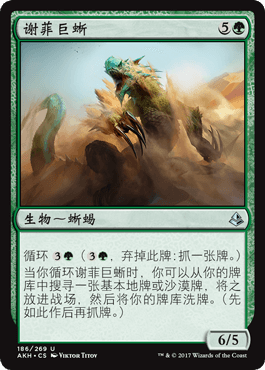 我避开了最后一句话,因为那句话是最令人兴奋的。“每当一个沙漠在你的操控下进战场时,派出两个1/1,红绿白三色的砂/战士衍生生物。”这种“每次地落生成衍生物”带来的价值,远远超过了我们通常对三法术力生物的预期。这些特定的战士衍生物使我们构筑套牌时能有更大的发挥空间,而且这个能力鼓励我们在一般情况下多次使用地。