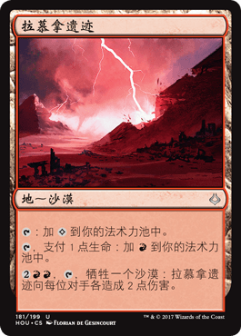 但这些沙漠中只有6个可以自己产生有色法术力,而且没有一个沙漠能在没有额外要求的情况下产生超过一种颜色。配合38个地的卡组(假设我们根据模板选择了最大数量的地),这就只剩下了22个非沙漠地空位,显然这对我们的法术力基础造成了不小的压力。这意味着我们将需要一个稳固的找地地和电震地的法术力基础,以确保我们能及时产出用来施放我们指挥官的三个颜色。