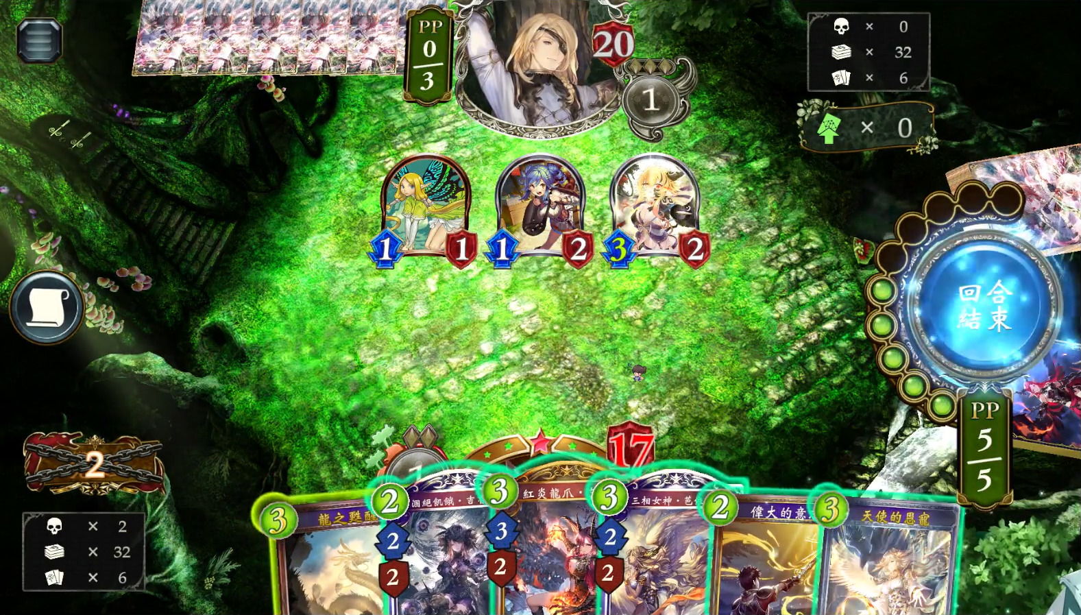 中期继续跳费,以便尽快用出终焉之地。觉醒后可以暂缓跳费,优先争夺场面或过牌。但也应留意已消耗费用,如果跳费获得的额外费用恰好可以帮助究极巴哈姆特在接下来的1~2个回合内瞬念召唤,应当跳费。