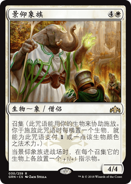 最后的膨胀手段是景仰象族,一张非常有趣的单卡。得益于衍生物快速铺场思路,通常我们可以以很低的费用(甚至是0费)召集施放景仰象族的同时膨胀场面。免费的4/4听起来很不错,但是仍有一些问题。横置所有生物召集象族有些时候会非常尴尬,让我们陷入两难的境地:是打当回合伤害还是增加下回合潜在伤害。当使用大象时机好的时候,上限会非常高(想象一下2回合扬起警报3回合幽灵行列,横置5个衍生物去召集景仰象族给所有衍生物放+1/+1指示物),但当他时机不好的时候,基本上就会卡在手里直到游戏结束。这也是为什么套牌里只带了两张。
