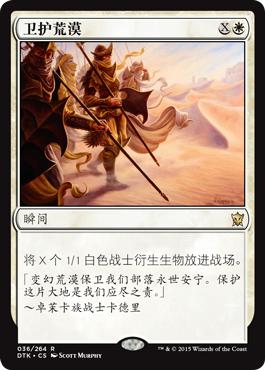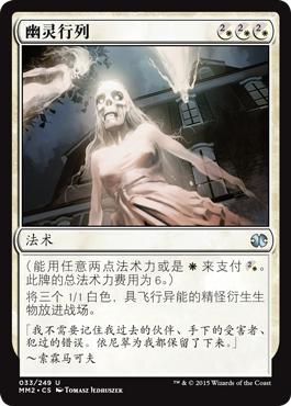 之后的回合里我们的衍生物源还有幽灵行列和一张卫护荒漠。虽然效率不是很高,卫护荒漠在游戏后期我们有一堆地的时候还是很扎实的牌,可以在对手回合结束时造很多人,争取重置后一脚带走对手。幽灵行列是这套牌中最好的牌之一。套牌中所有的地都能加白色法术力,所以它永远是一个3费派出3个飞行精怪的高分牌。配合一个或两个在场上的赞美诗,空军是赢得游戏的最好途径。