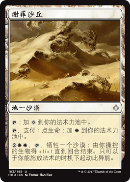 在法术力方面,纯色套牌很适合精打细算。模式双面牌伊美黎召令和卡彼拉猎捕在套牌中有三重职责。我们经常会用他们当地,但是咒语那面也经常影响对局。卡彼拉猎捕可以利用套牌在场上铺满生物的长处,如果铺开得很顺利,伊美黎召令也可以作为终结手段。但是我们使用一组伊美黎召令最大的原因是因为它是一张可以被美善之力放逐的地。得益于双面牌,我们只需要用15块“真正的地“,其中5张是**沙丘,可以当作一次性膨胀使用,以及雅登瓦堡作为另一个长盘对局的衍生物源。