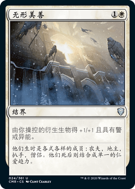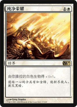 说到赞美诗,有几种不同的方法去让1/1衍生物成长成为真正的威胁。美德之力可以说是这些中最强的一张,因为我们多数时候是放逐一张任意白色牌来免费释放它。偶尔也可以因为它接一些荒谬的起手:前两回合出2到3个衍生物,放逐其他手牌来让复数个美德之力进场来赢下游戏。除了美德之力外,我们还有纯净荣耀和无形美善,事后我可能会用3个纯净荣耀而不是现在2张1张分开。尽管无形美善提供的警戒很棒,但问题是它只能给衍生物提供膨胀而纯净荣耀还可以膨胀瑟班巡检官,坚定援兵等生物。除了衍生物源以外我们最想见到的就是这些牌,仅靠1/1生物打出20点伤害非常困难,一但把他们变成2/2或者3/3后就会简单很多。