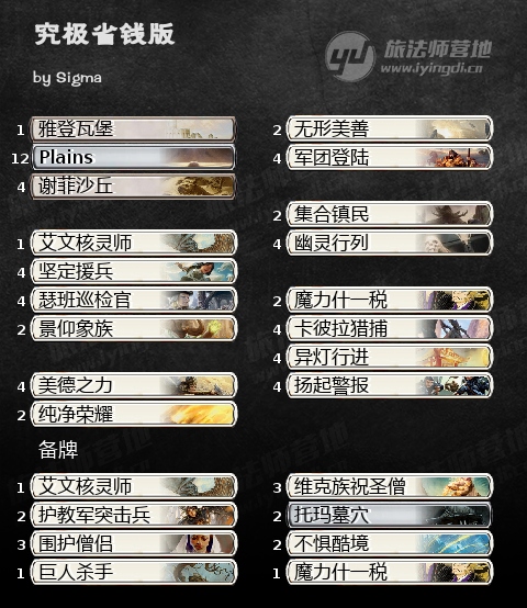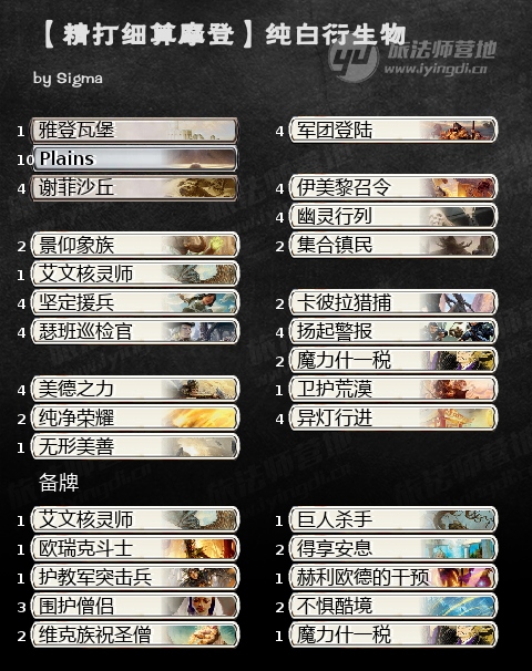 就互动而言,异灯行进提供了一个有效率的方式去除几乎所有威胁。魔力什一税——我最喜欢的卡之一——极棒的方法去“抓住”没有防备的对手。没有人会绕着一套白色衍生物套牌的反击咒语打牌。扬起警报,坚定援兵和卫护荒漠可以在瞬间时机打出让魔力什一税更上一层楼。我们可以留费让过,如果需要康些什么就打出魔力什一税,如果没有这样的机会就可以去施放瞬间时机的衍生物制造源。最后,带了一张艾文核灵师可以卡住一些找地地并且在对阵太古泰坦套牌起到关键作用。